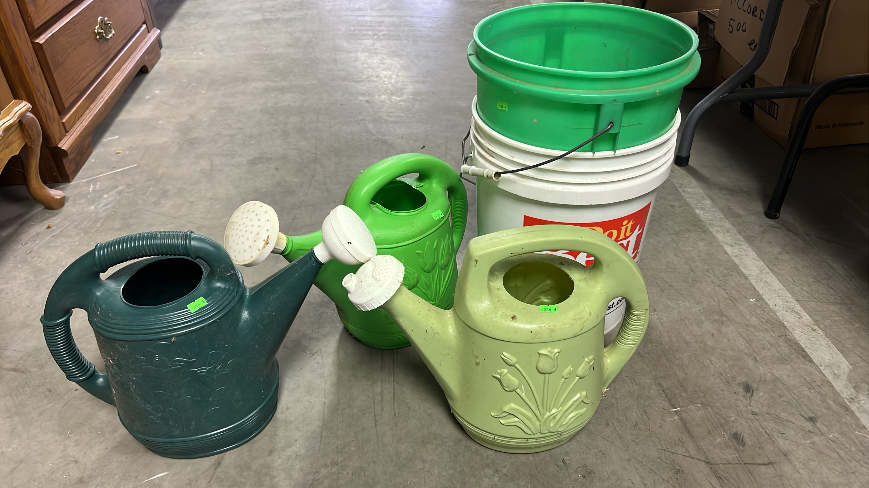 334 Three - Plastic Watering Cans & Two 5 Gallon Buckets • misc