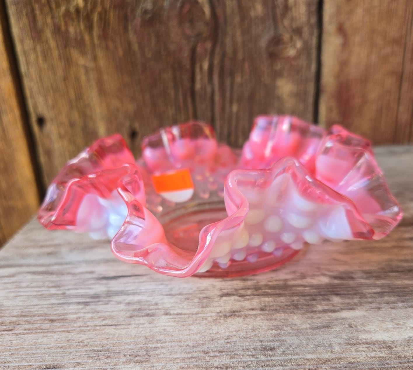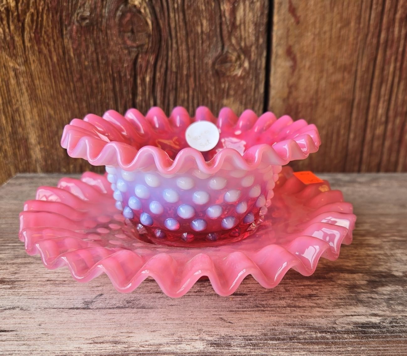 25 Unmarked Fenton Hobnail Cranberry Ruffle Bowl and Plate 6”