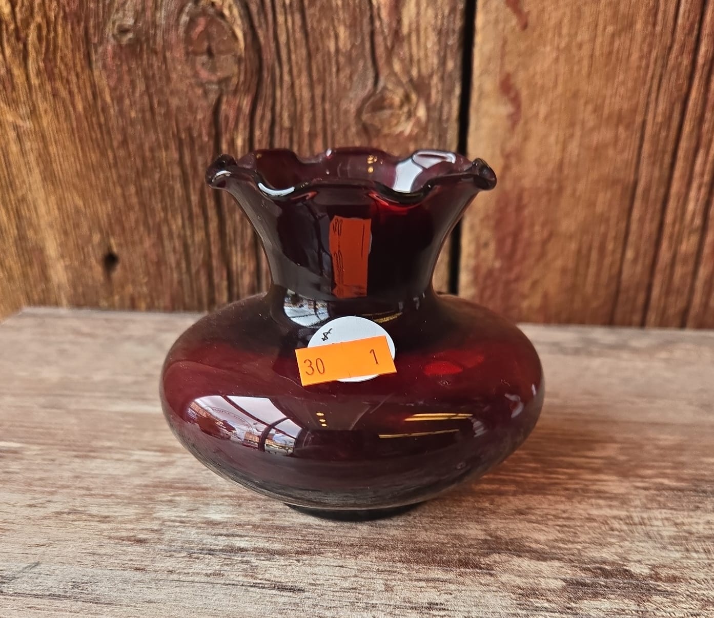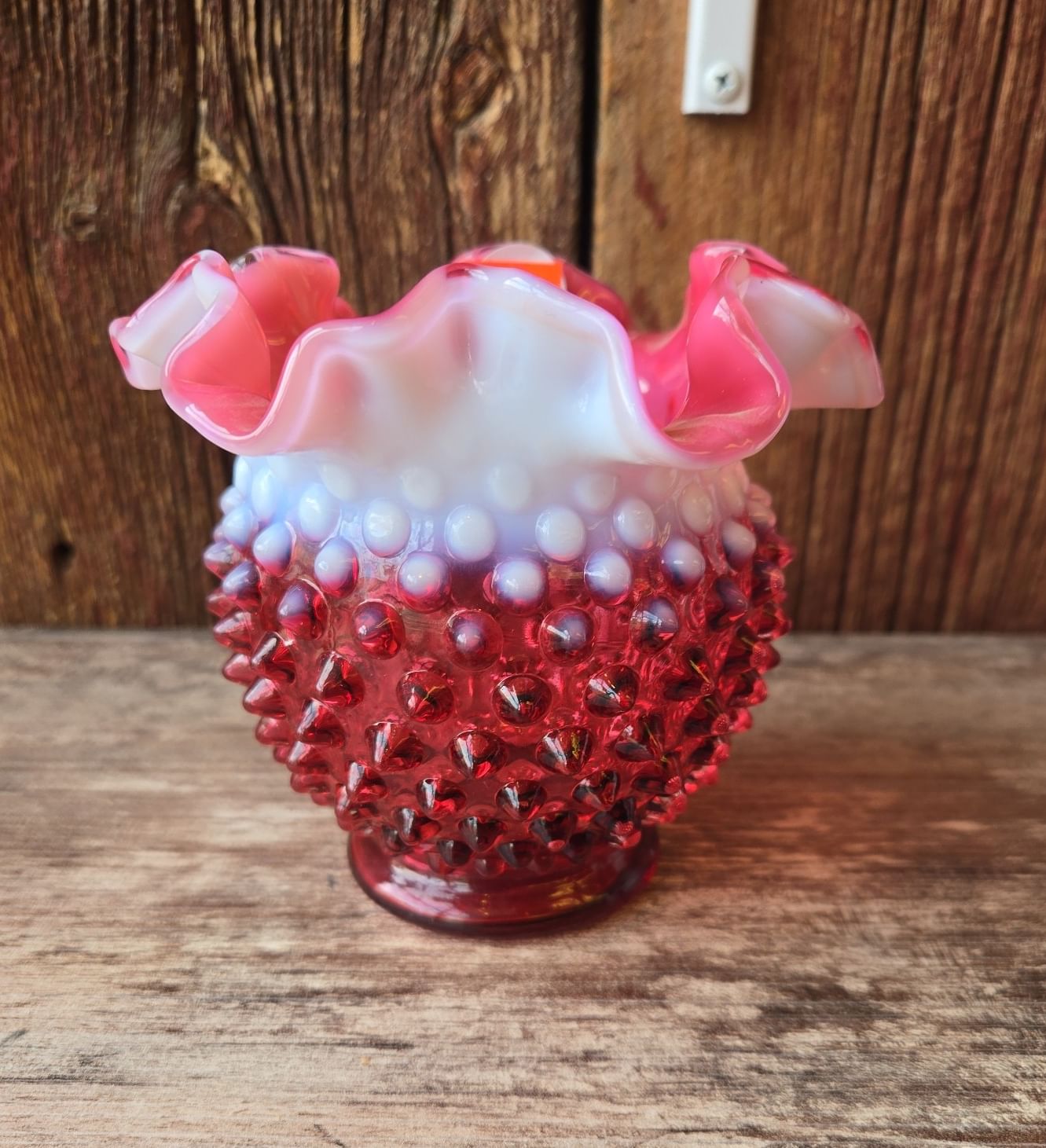 26 Unmarked Fenton Hobnail Cranberry Opalescent Ruffle Vase 4.5”