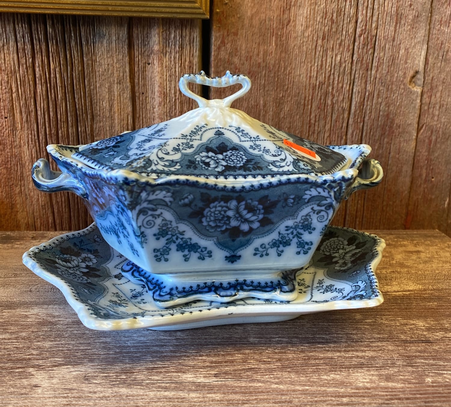 45 Flow Blue Sauce Tureen, Argyle Pattern with plate 9”