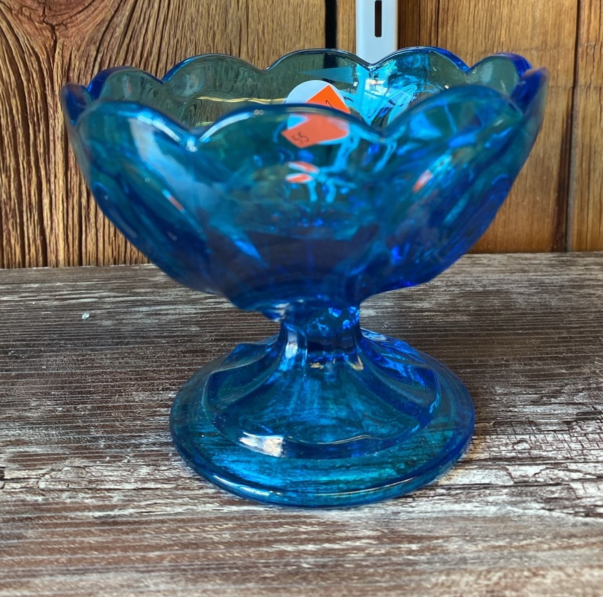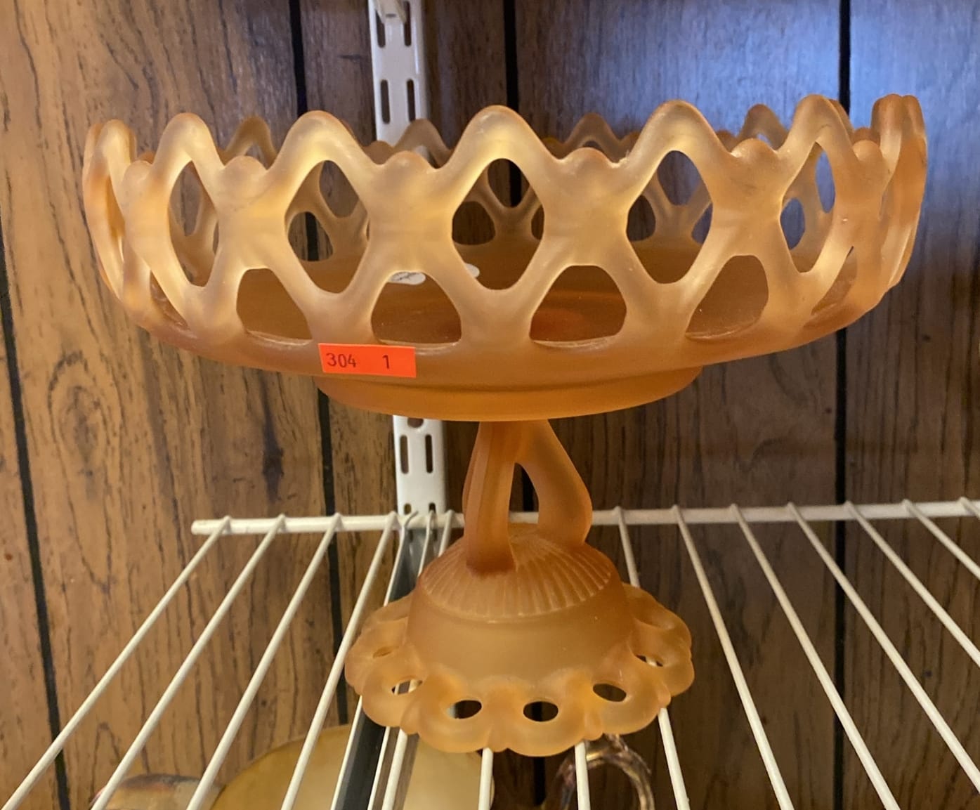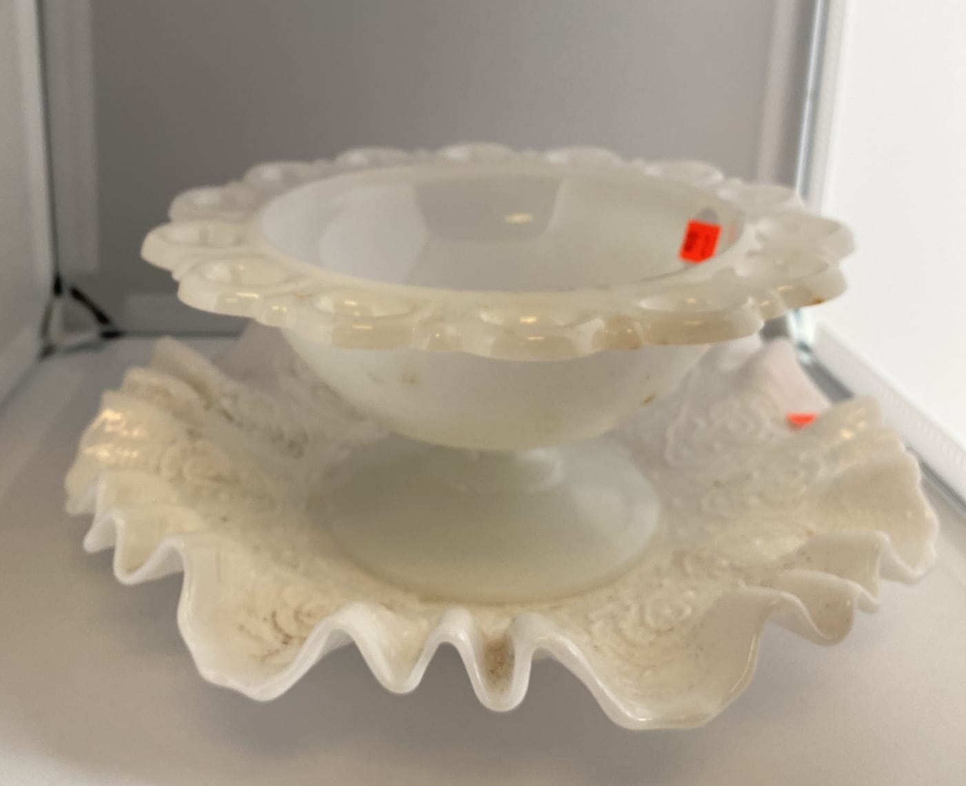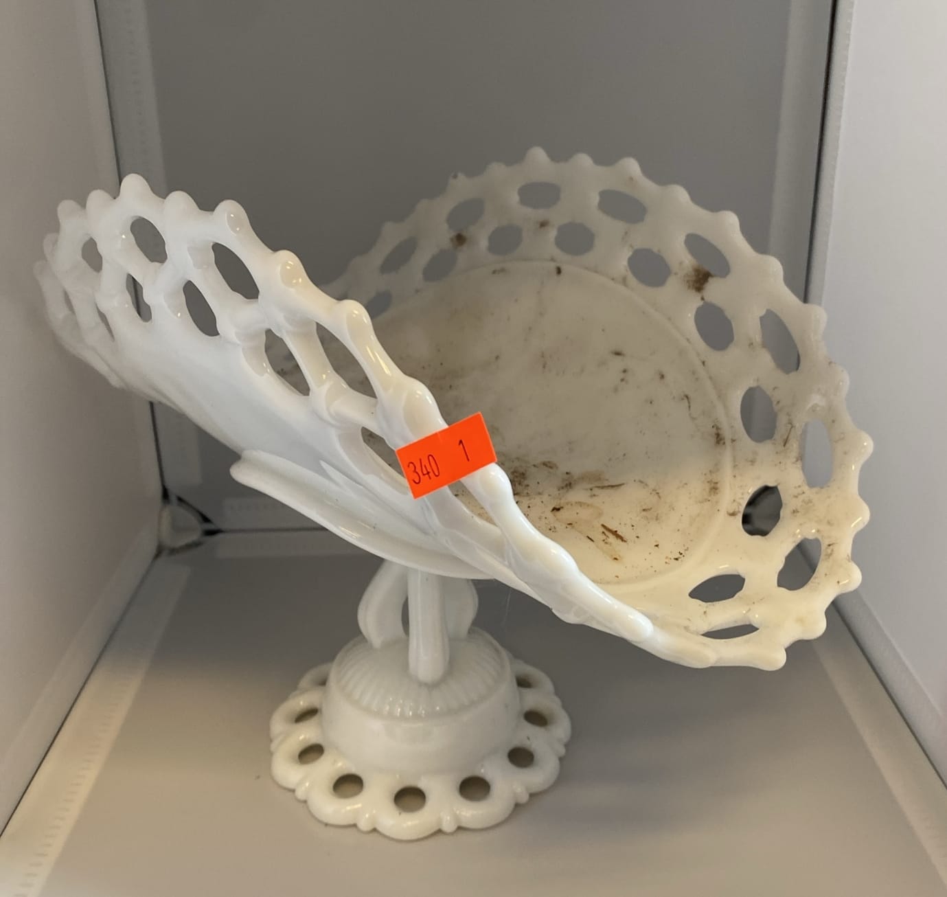 337 Unmarked Old Colony Open Lace Edge Milk Glass Footed Candy Dish Compote, Milk Glass Ruffled Edge Dish 7”