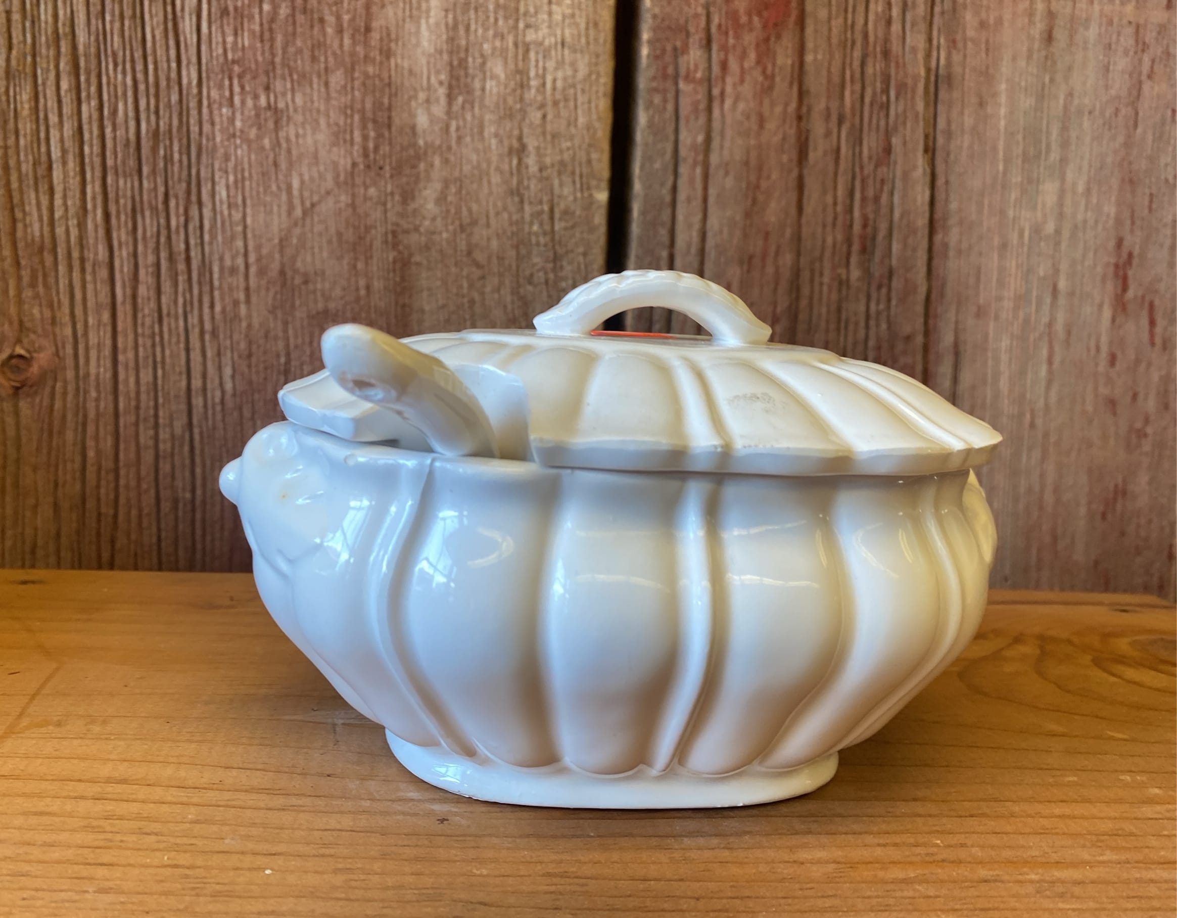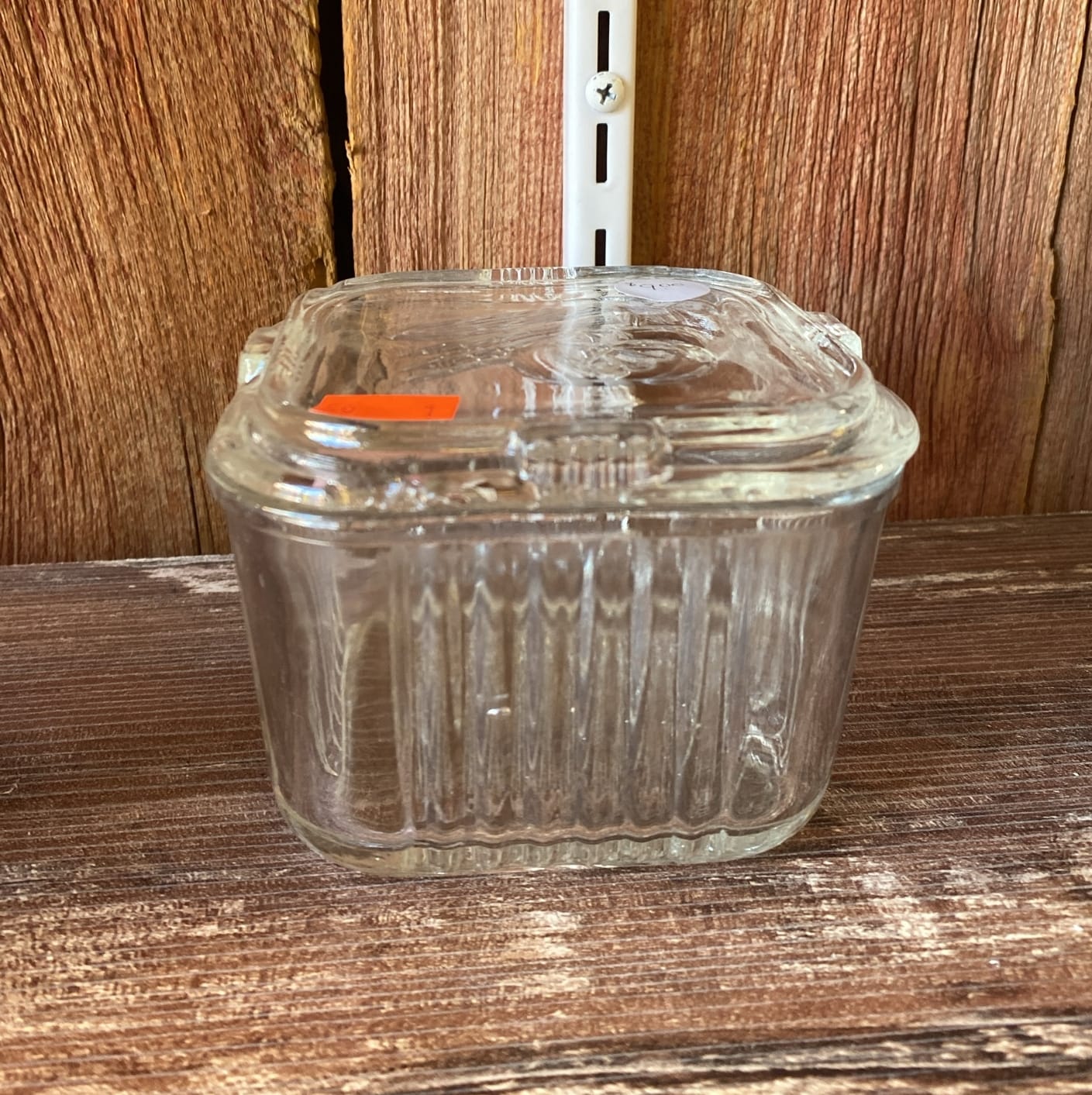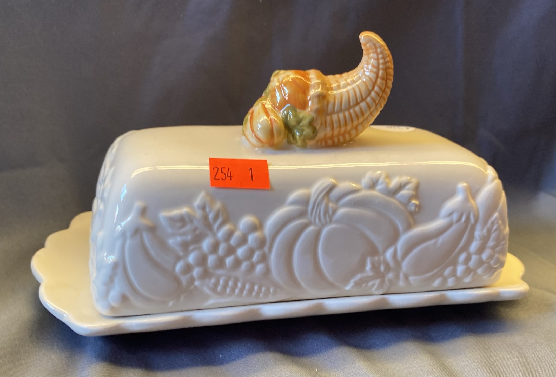 254 Ceramic Beige Butter Dish with cornucopia on top 7.5”
