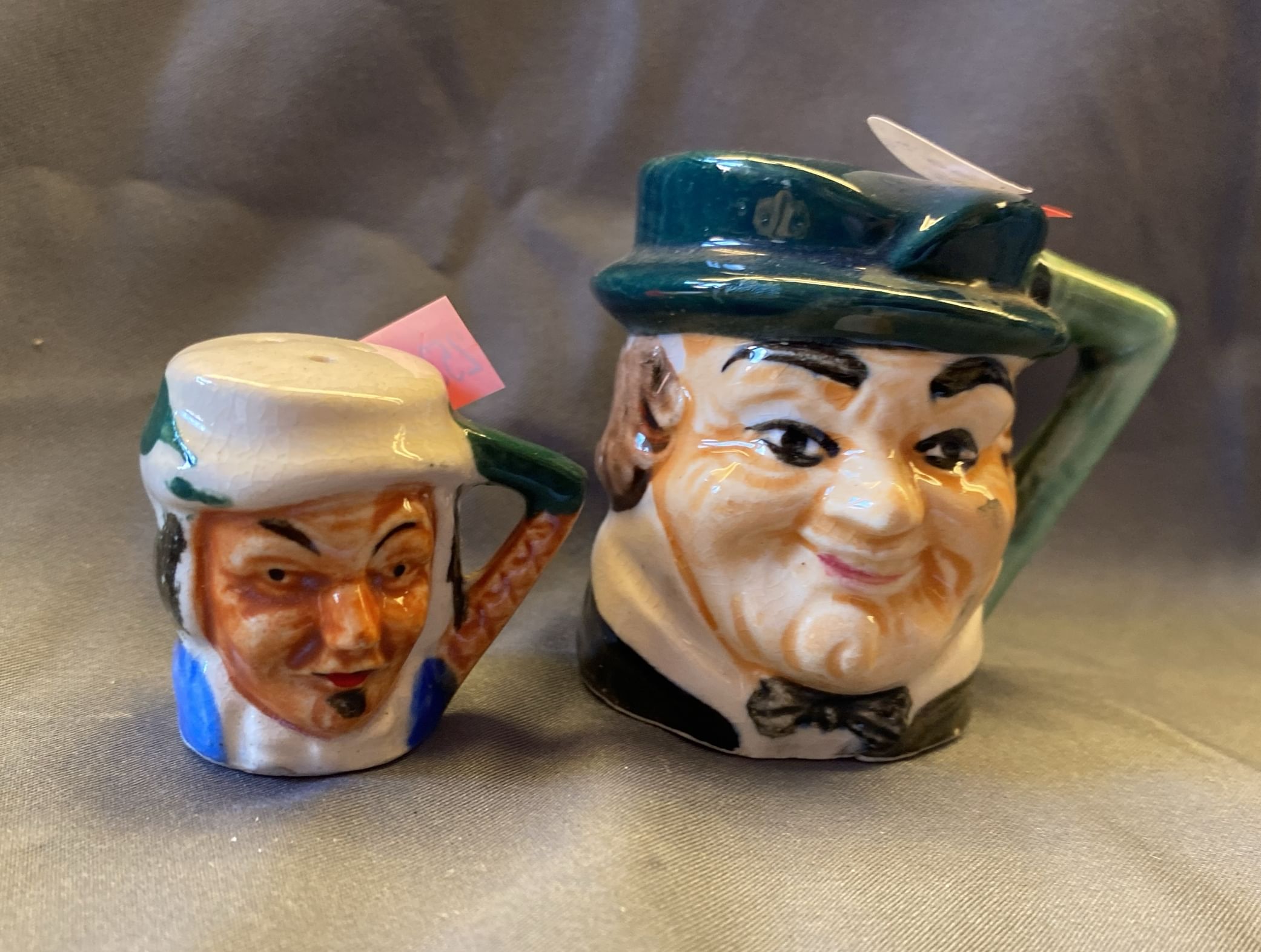 253 (2) Hand Painted Toby Style Mugs Salt and Pepper Shakers, Japan 2” 3”