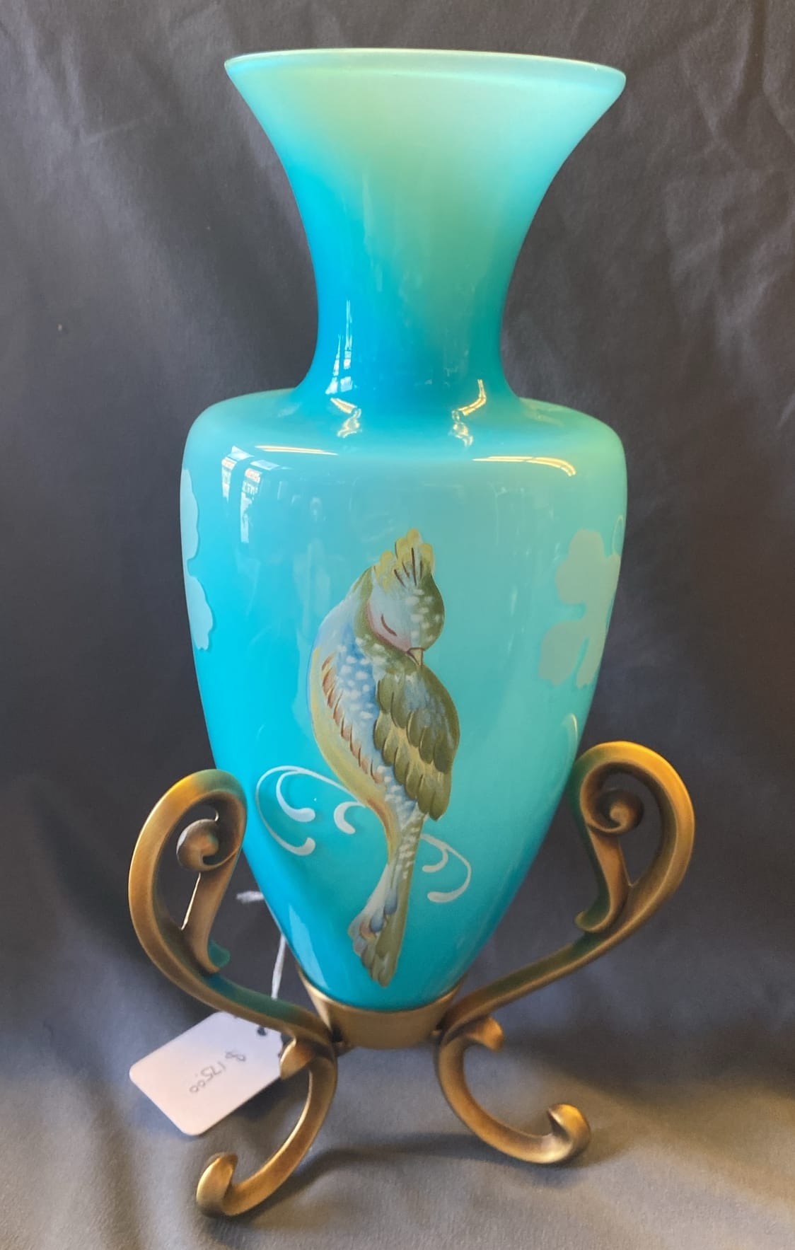 263 Fenton Hand Painted Hummingbird Vase w/ Gold Toned Stand 11”