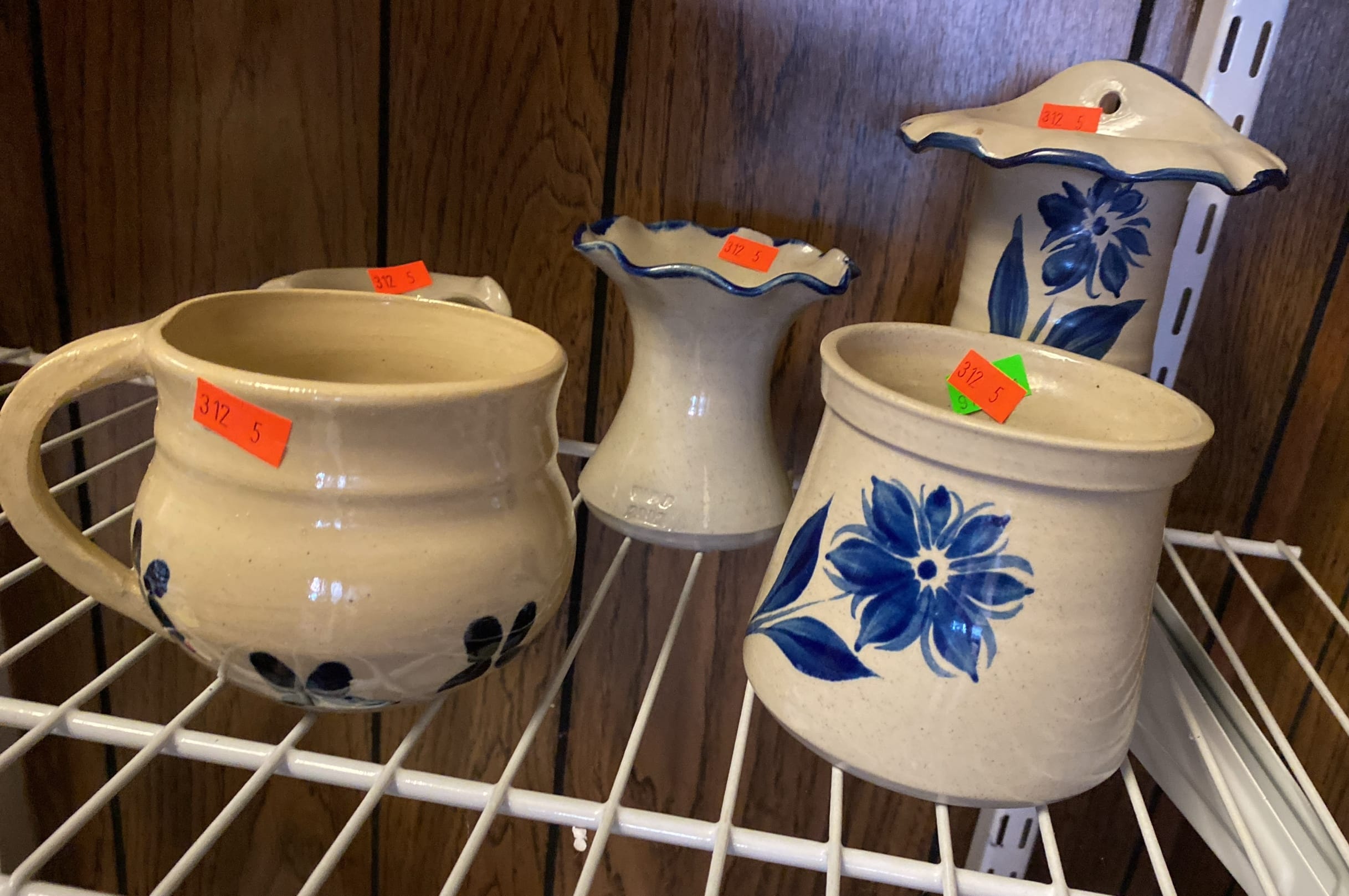 312 Williamsburg Pottery Blue Floral Art Pottery Crock, Creamer, Mini Vase, Vase 3-9”