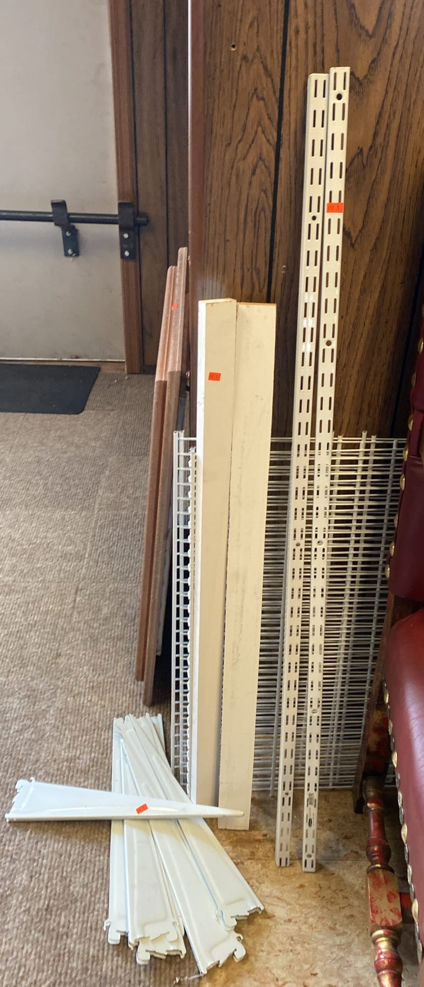 291 Metal Wall Hanging Shelf w/ 2 Wood Shelves 36x96” (Contents NOT included, Needs Removal)