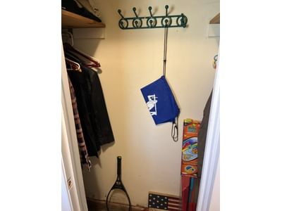 111 Coat, jackets, racket, hand weights, Delta box, contents of closet as shown in pictures