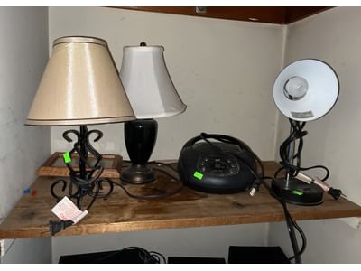 214 Desk and dresser lamps, onn CD player, picture, frame
