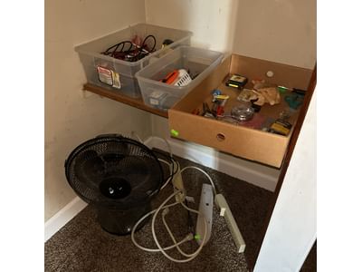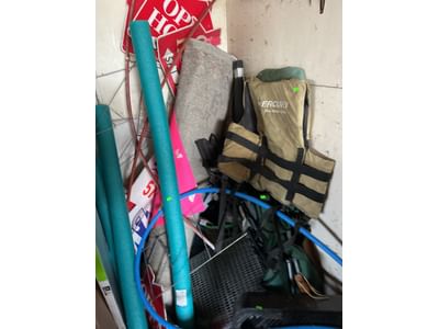 849 Box fan, pool noodles, Mercury life vest, contents of corner as shown in pictures