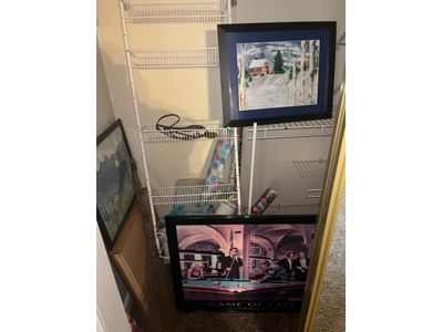 412 Framed decor, wrapping paper, hanging wire organizer, misc. contents of closet as shown in pictures
