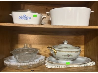 500 Corningware and porcelain dishes, egg plates, contents of cabinet as shown in pictures