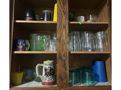 508 Drinkware assortment, Budweiser stein, green pitcher - chipped, misc. contents of cabinet as shown in pictures