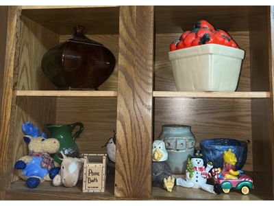 509 Decor and collectibles assortment, misc. contents of cabinet as shown in pictures