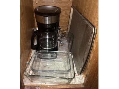 511 Continental coffee maker, glass baking dishes, cookie sheets, misc. contents of cabinet as shown in pictures