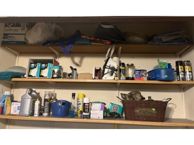 861 Wood shelf with contents inc. garden and cleaning supplies 32x64x14"
