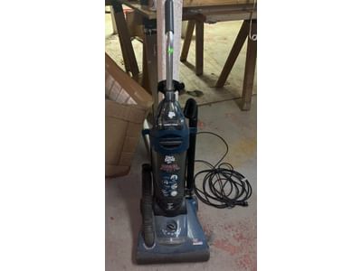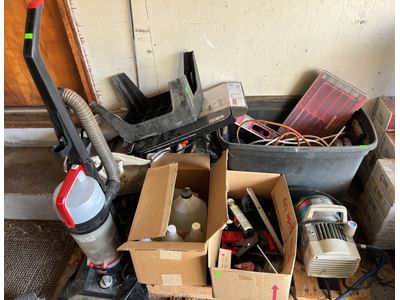 844 Bissell vacuum, plastic step stool, cleaners, Campbell Hausfeld Power Pal, caulk gun, extension cords, assortment