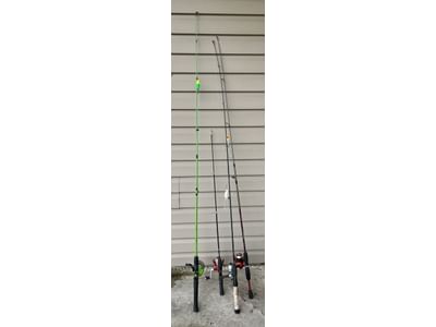 819 Fishing poles and reels includes Shakespeare Amphibian rod and reel, Shakespeare SPT46 rod and reel, Zebco Splash rod and reel