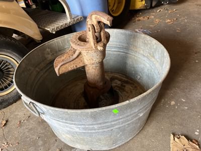 846 Galvanized wash tub, pitcher pump with broken handle