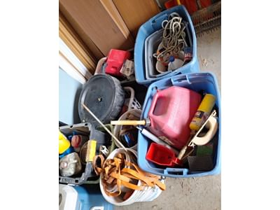 1019 Plastic totes, garden hose and tarps unknown size