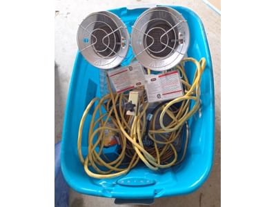 1023 Dual head propane heater, extension cord, misc