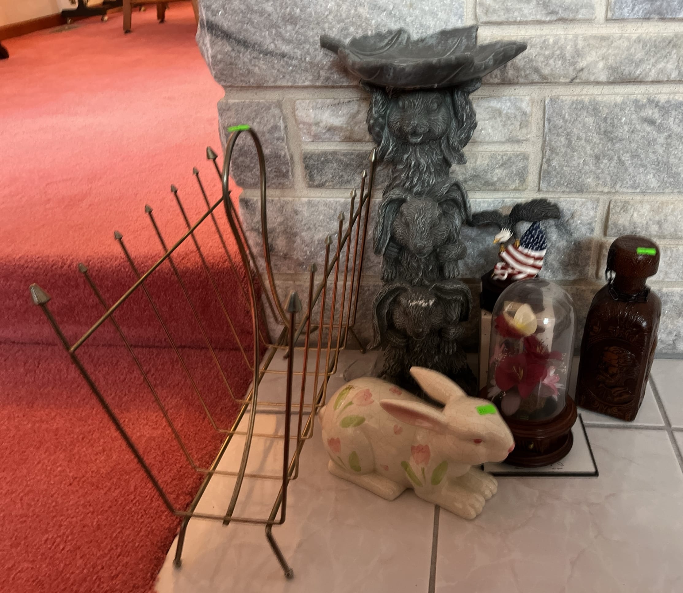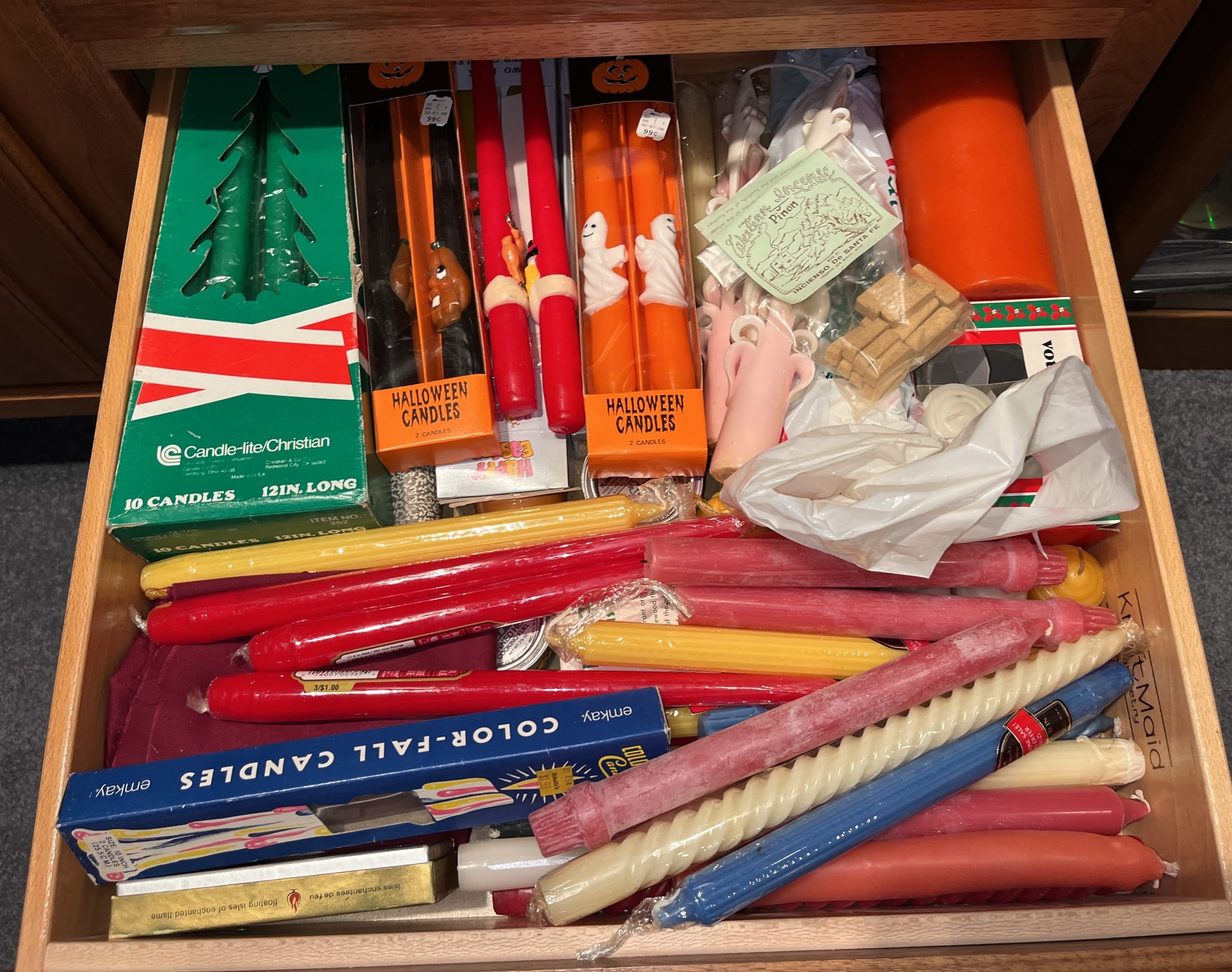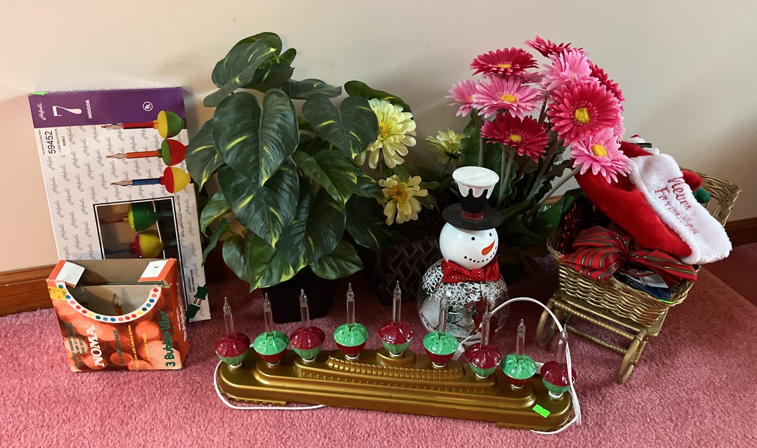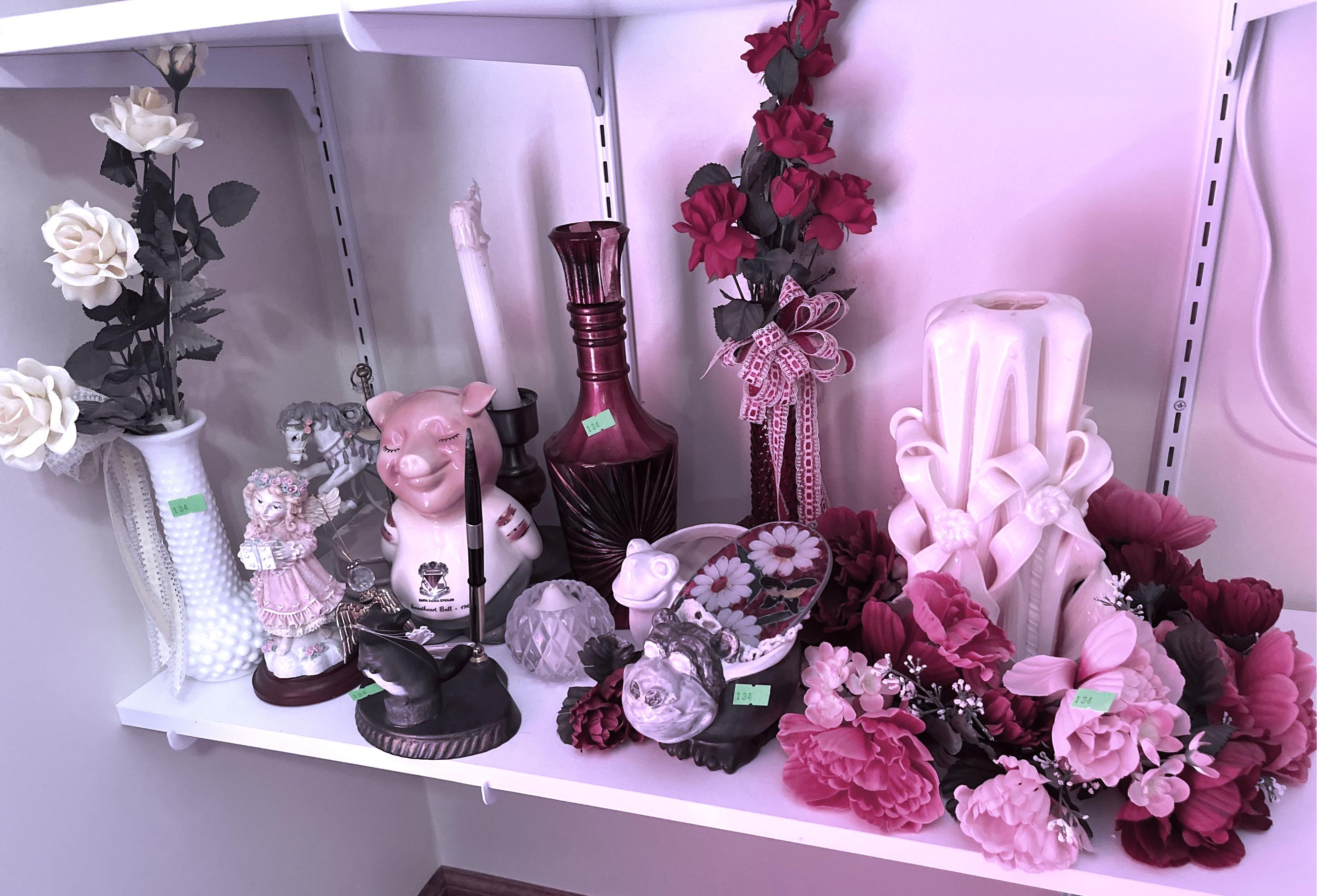 134 Candles, floral arrangements, vases, decanter, Kappa Sigma Epsilon 1960 piggy bank, planters, figurines, music box