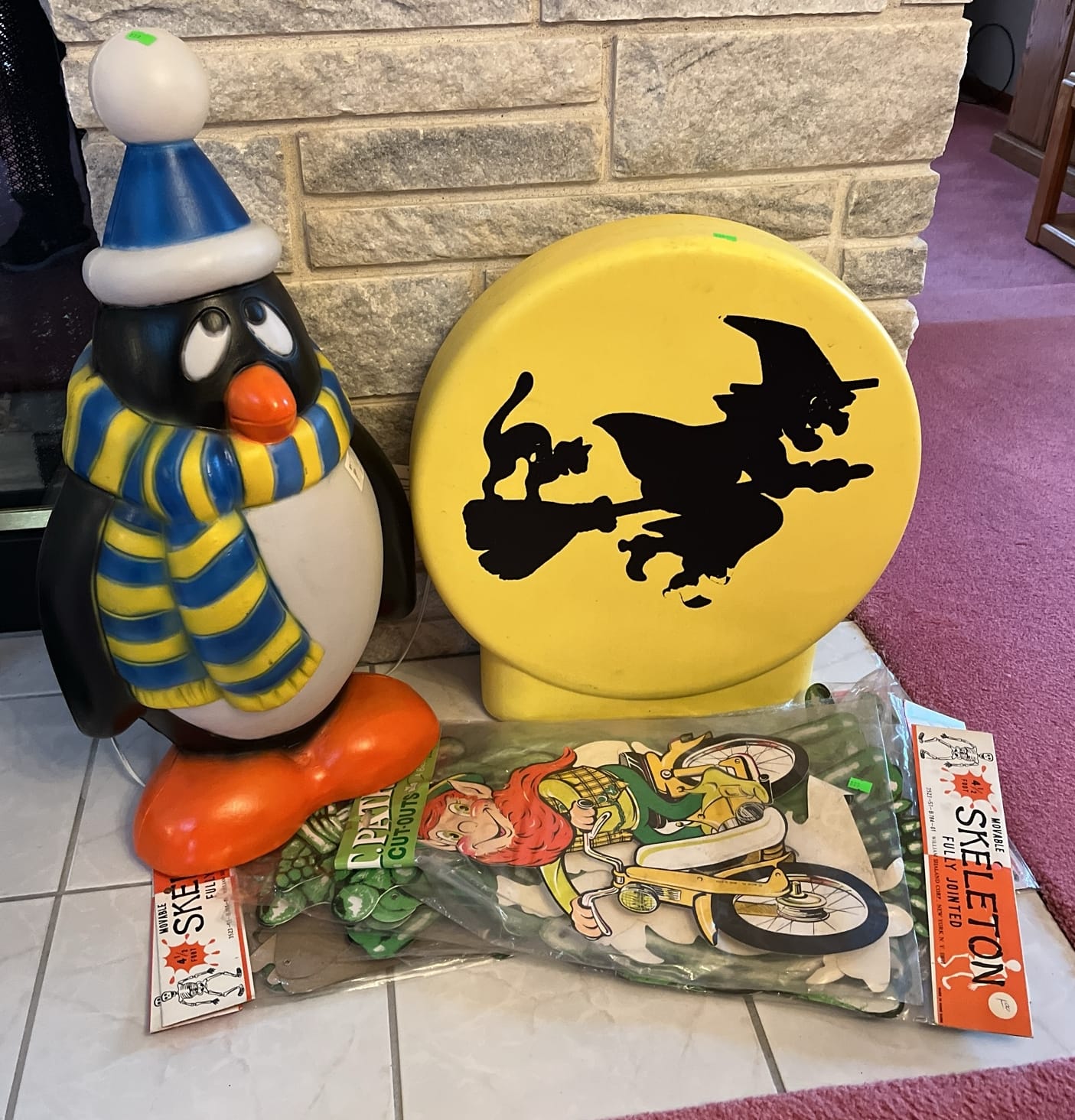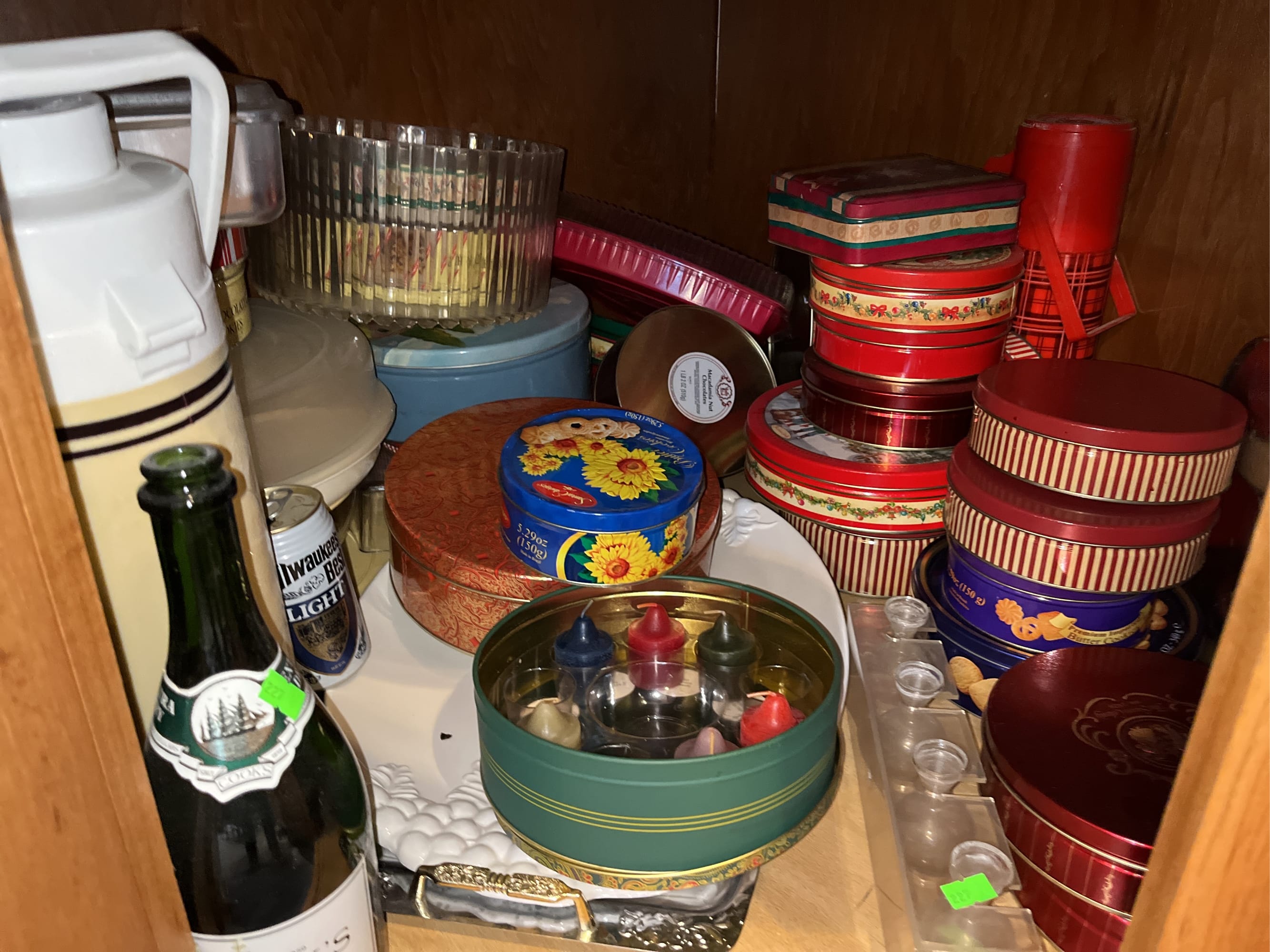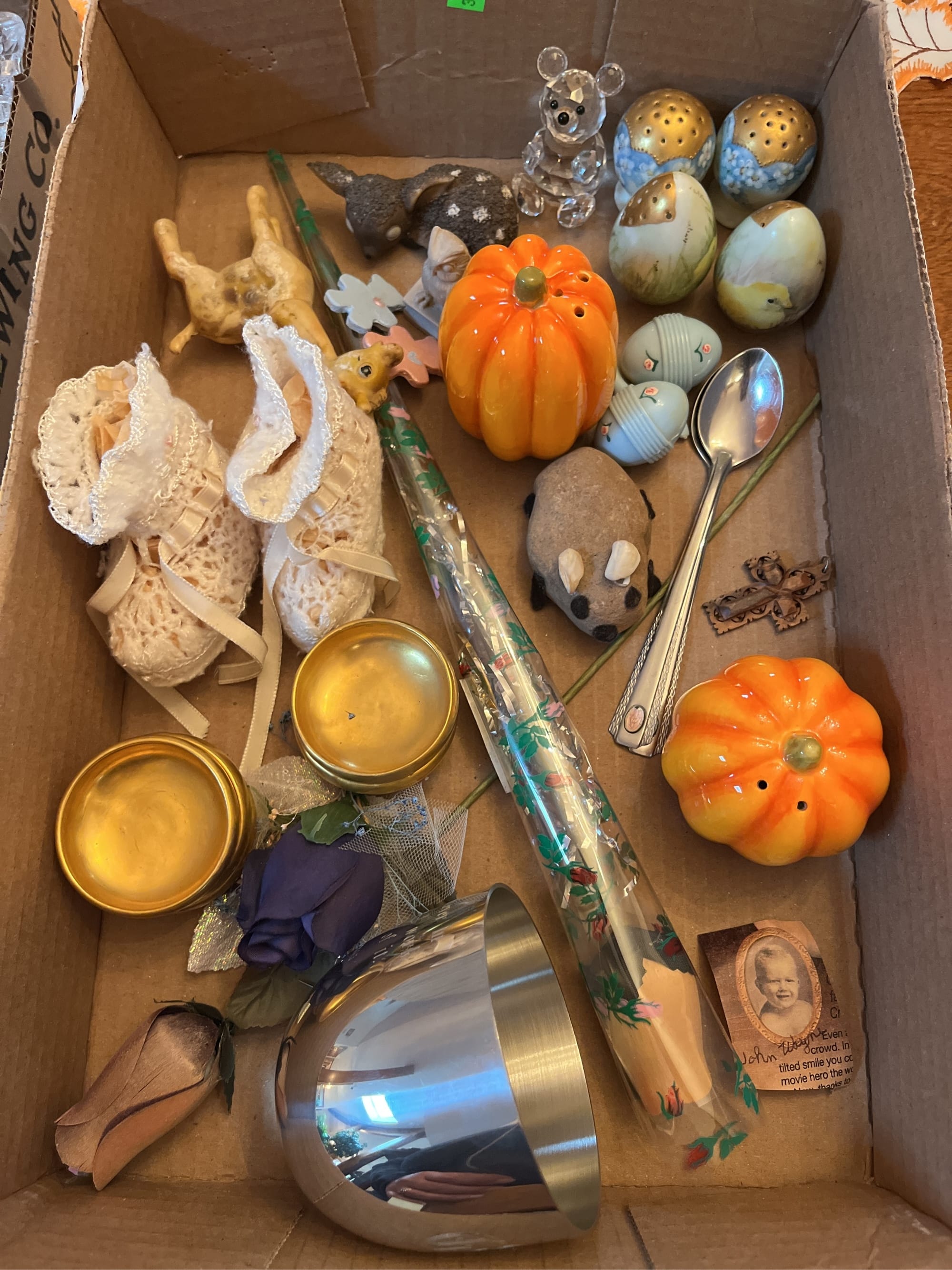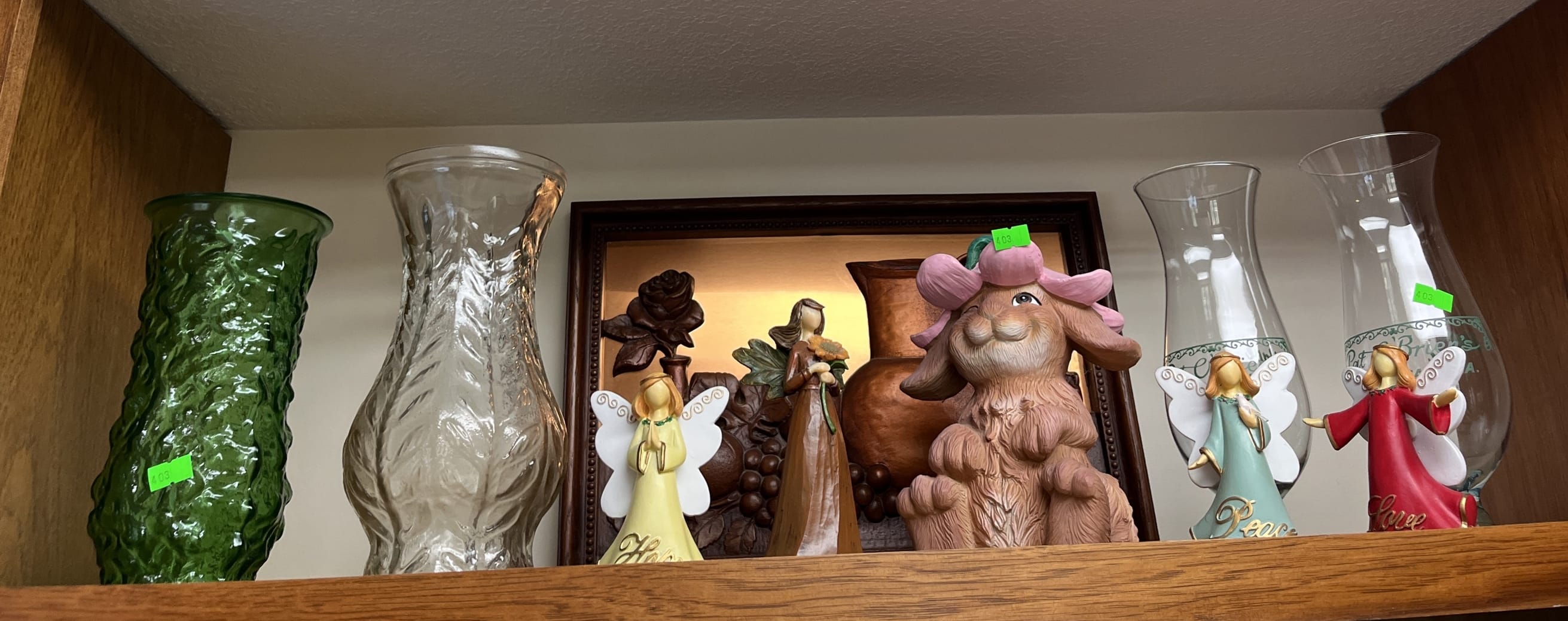 134 Candles, floral arrangements, vases, decanter, Kappa Sigma Epsilon 1960 piggy bank, planters, figurines, music box