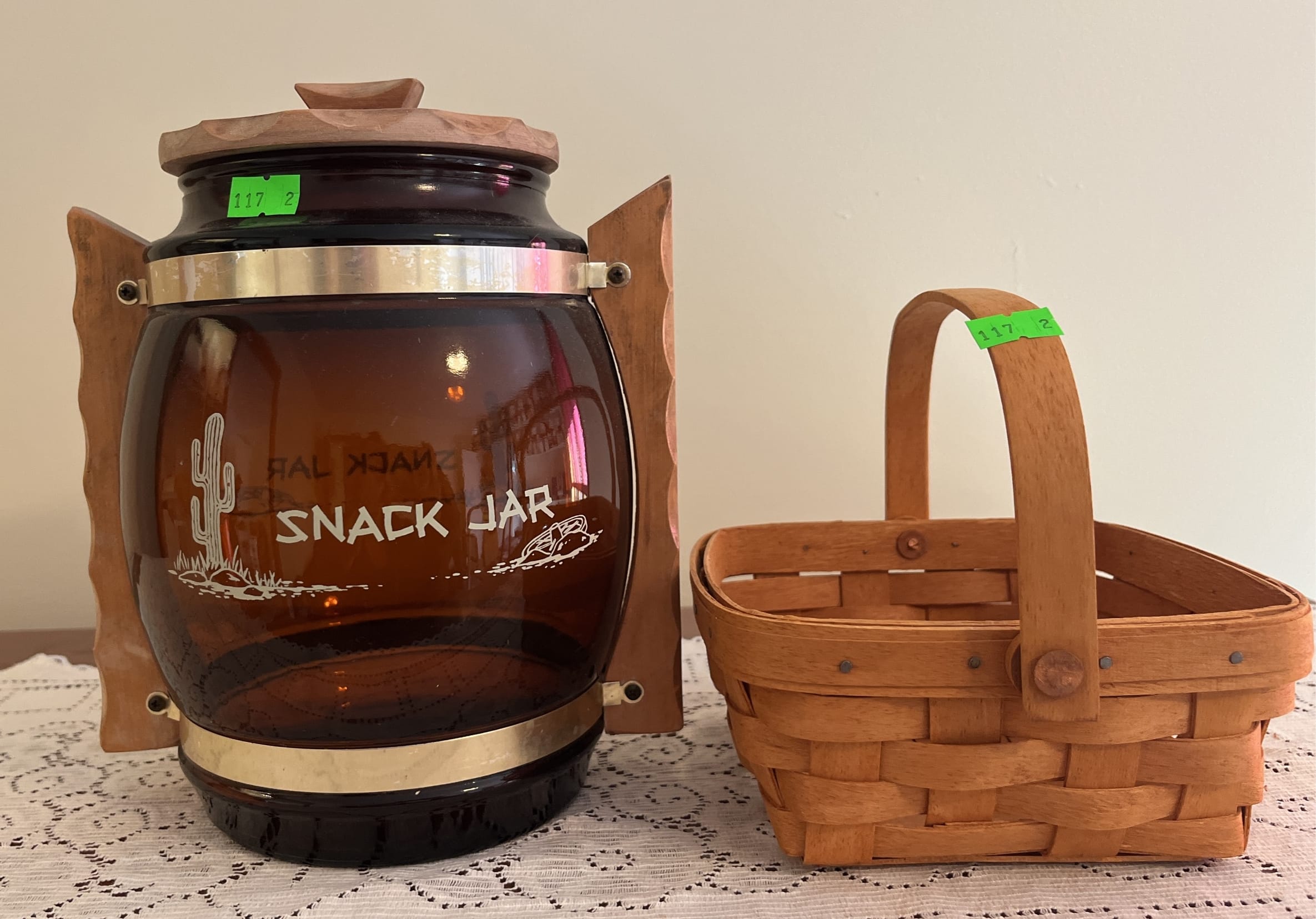 117 Siesta Ware snack jar 9”, Longaberger basket 6 1/2x6 1/2x3