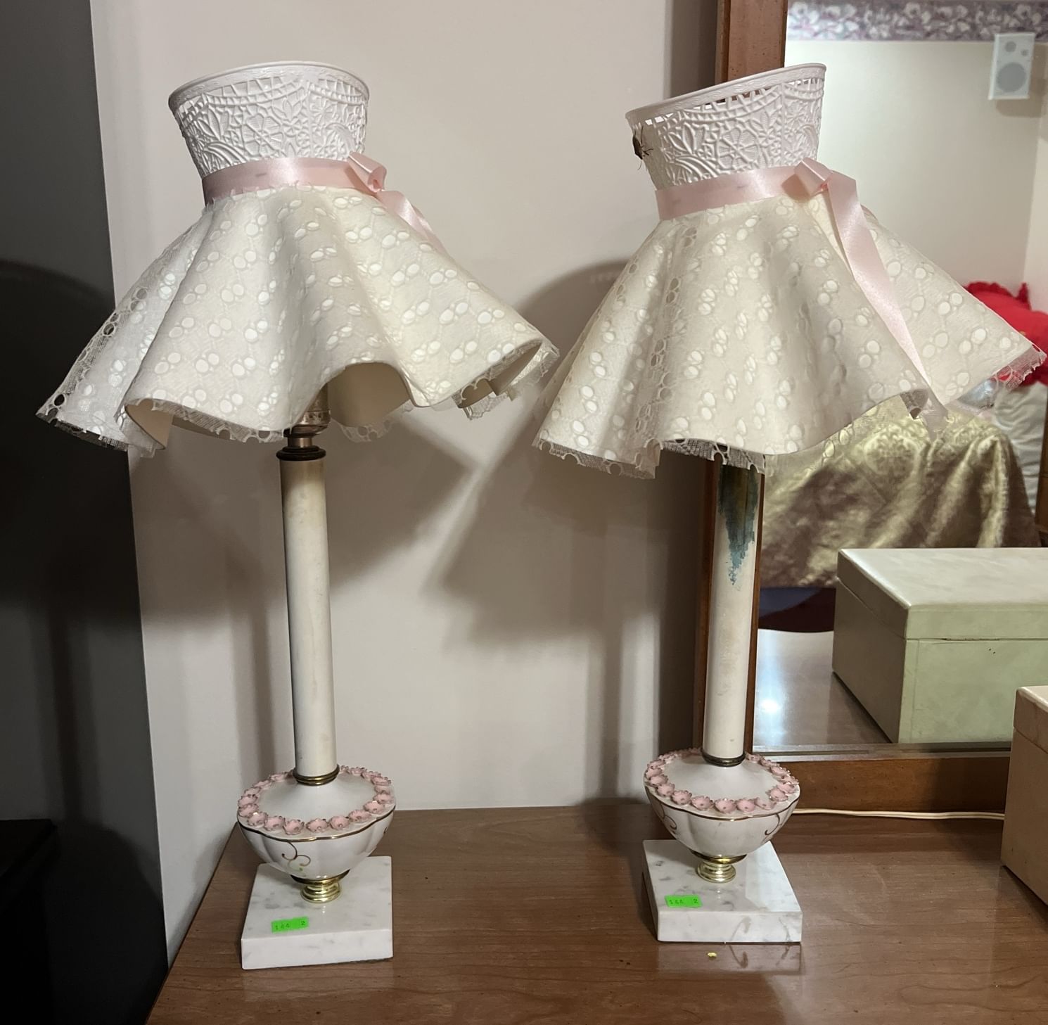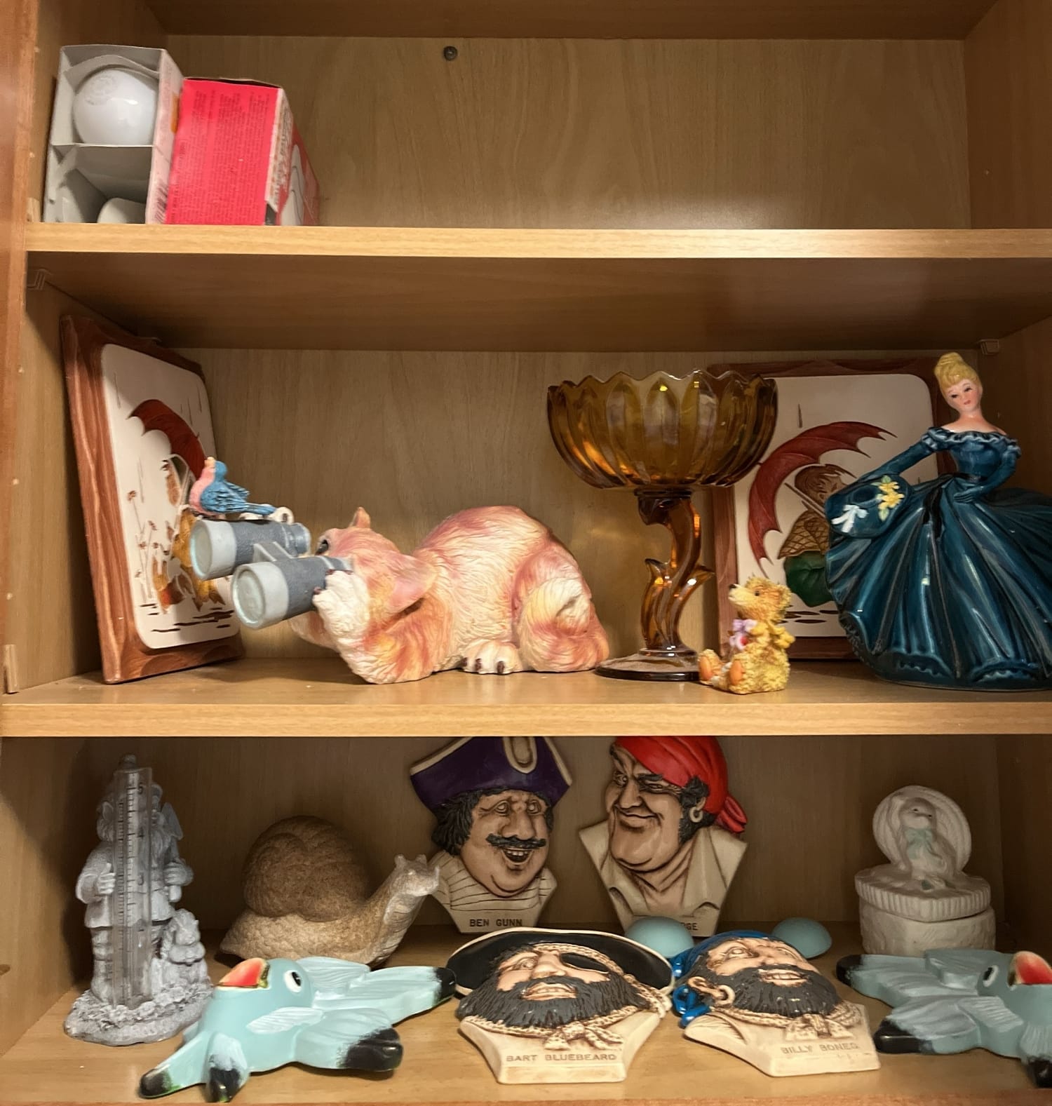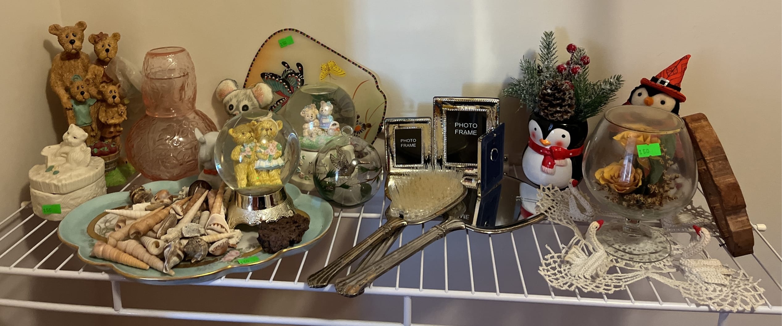150 Shells, snow globes, figurines, dresser mirror and brush, frames, pink depression water carafe and tumbler