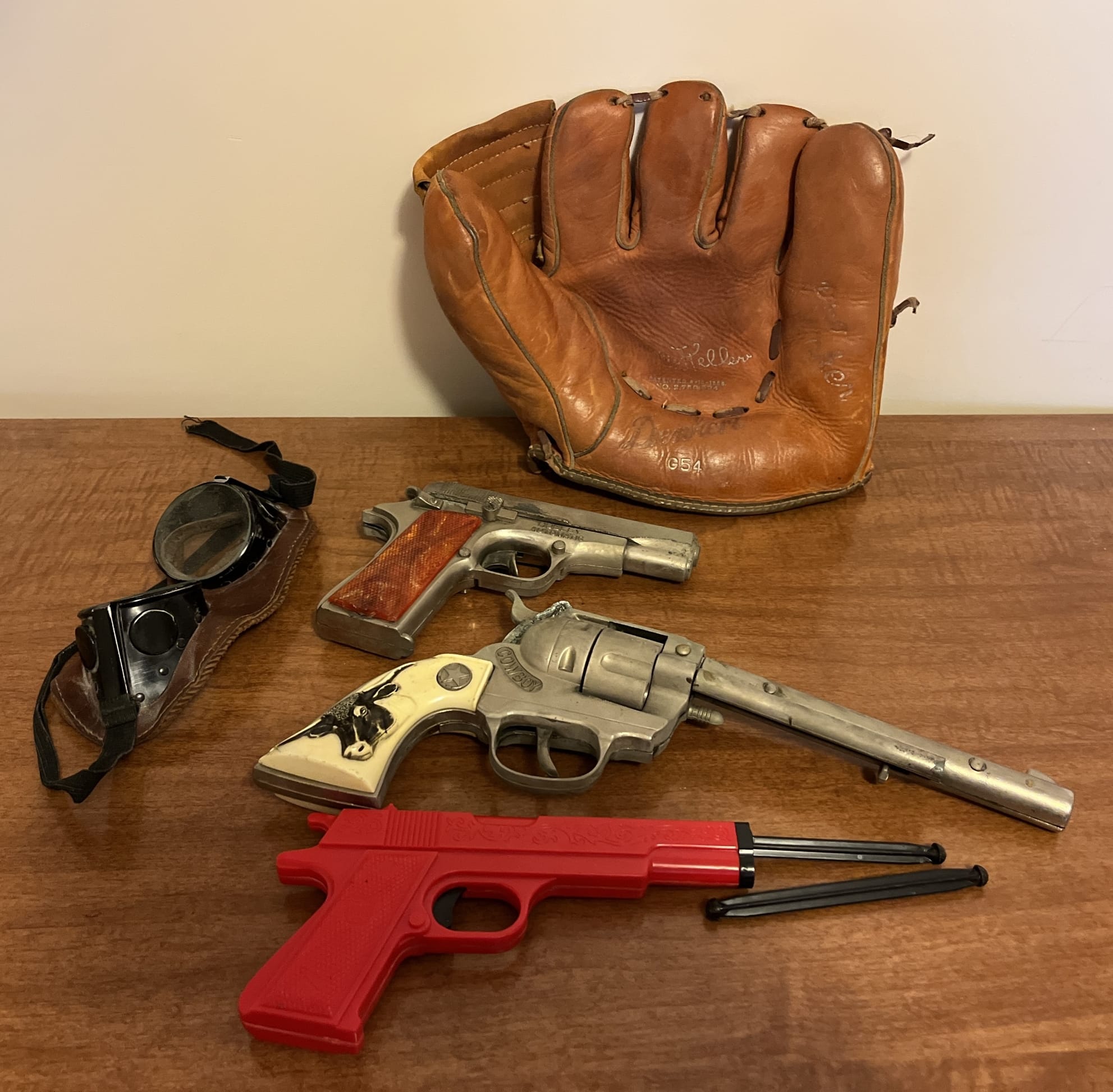 153 Dunkert baseball mitt, Cowboy and Hubley cap guns, plastic dart gun, goggles