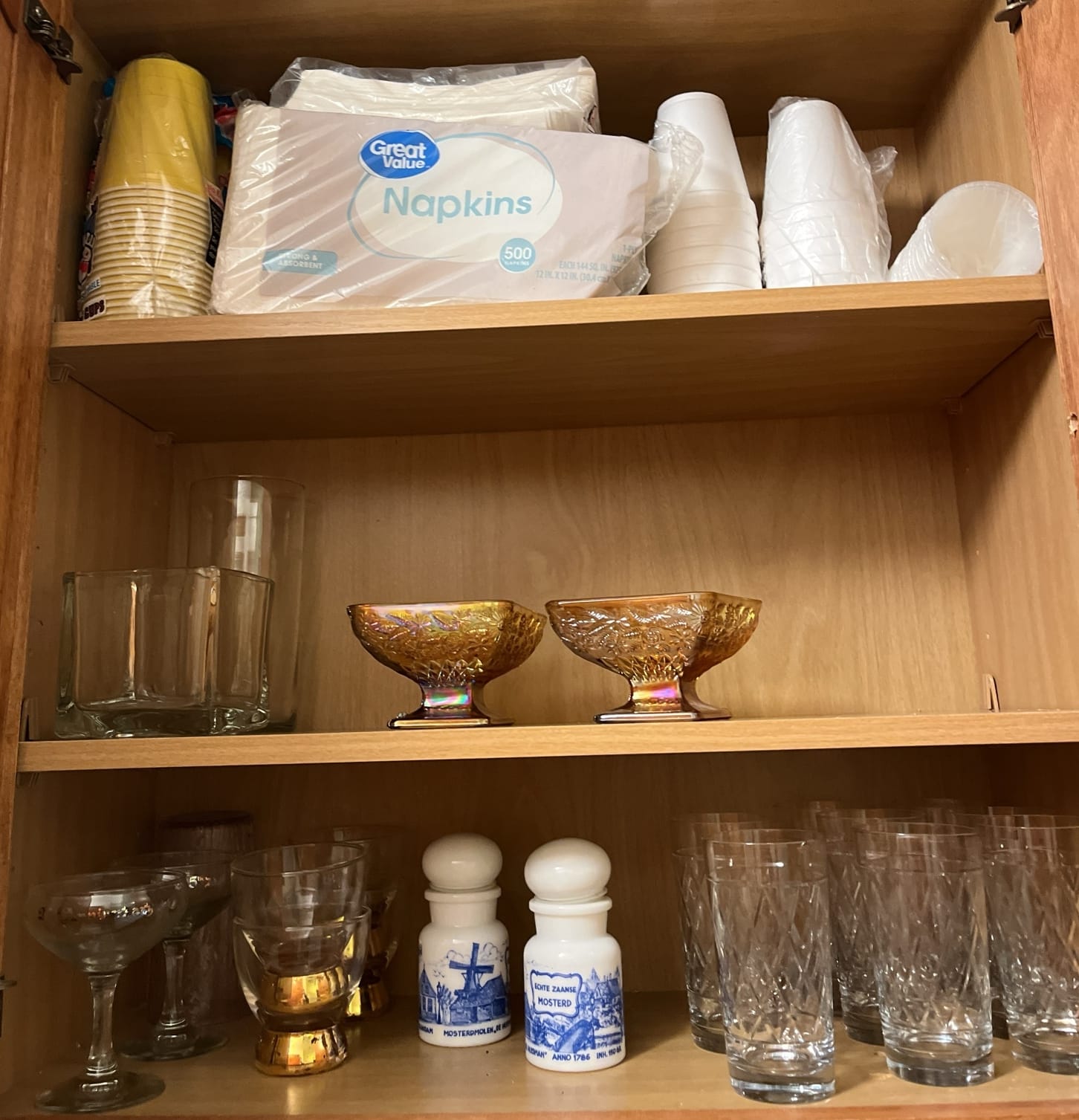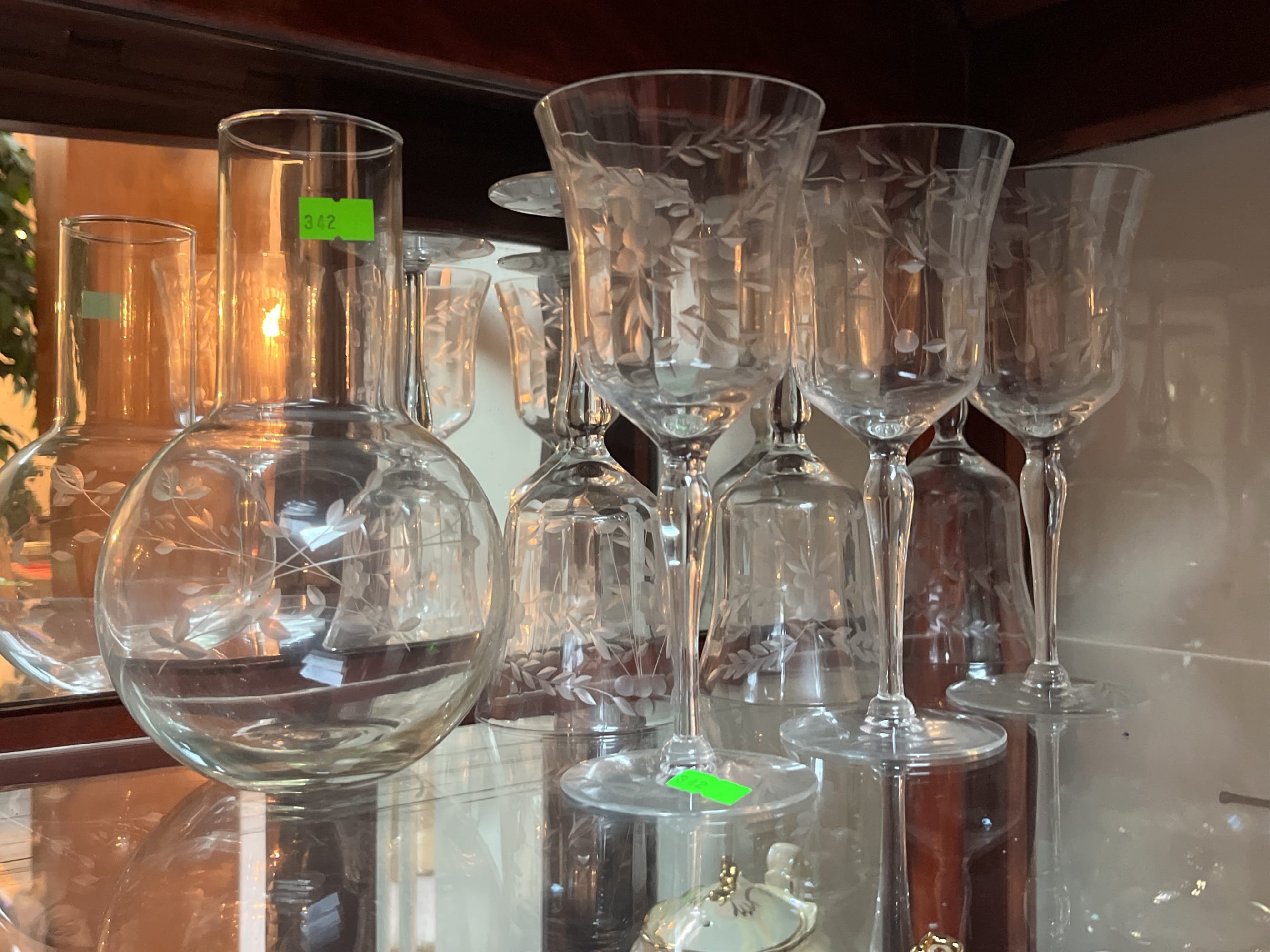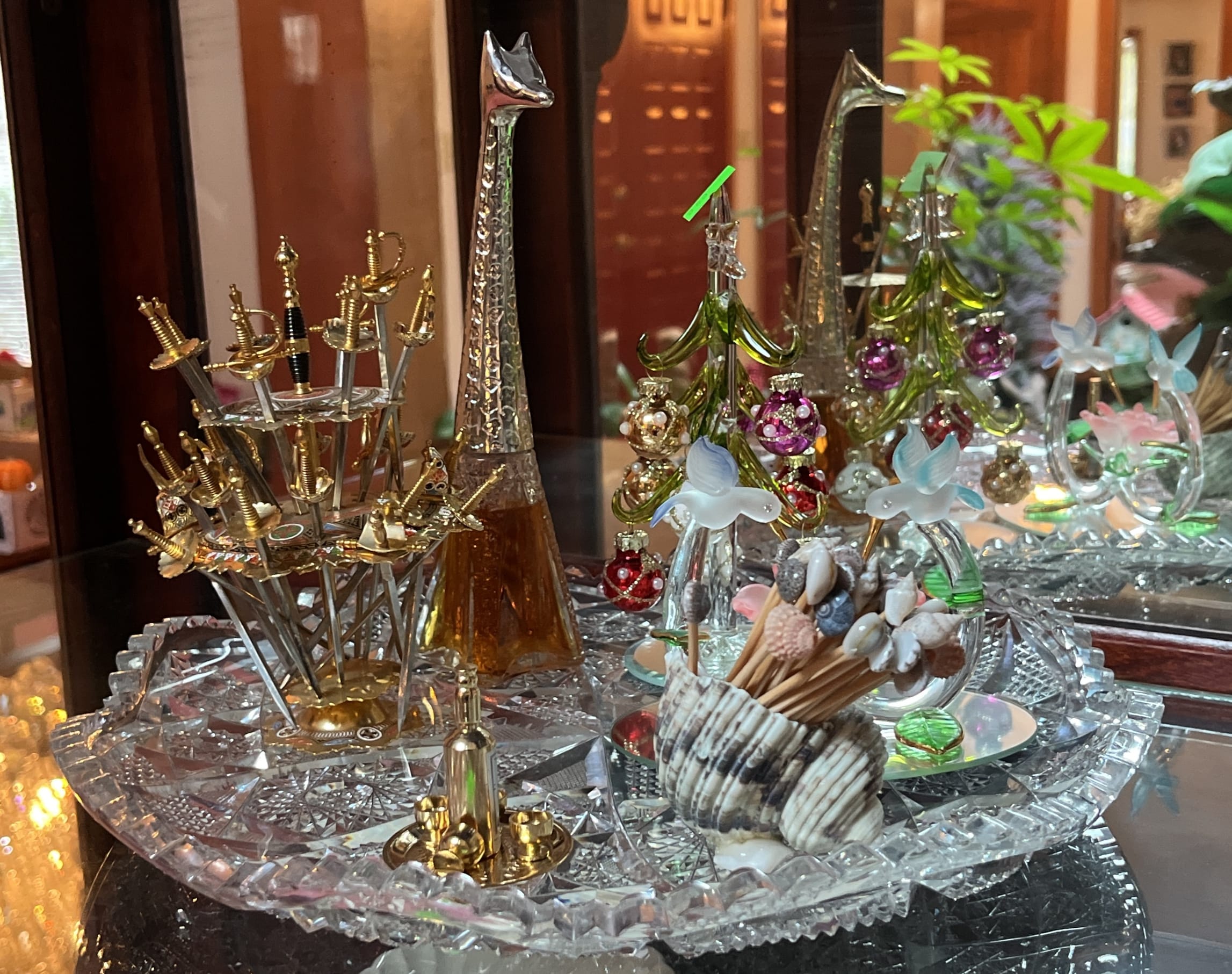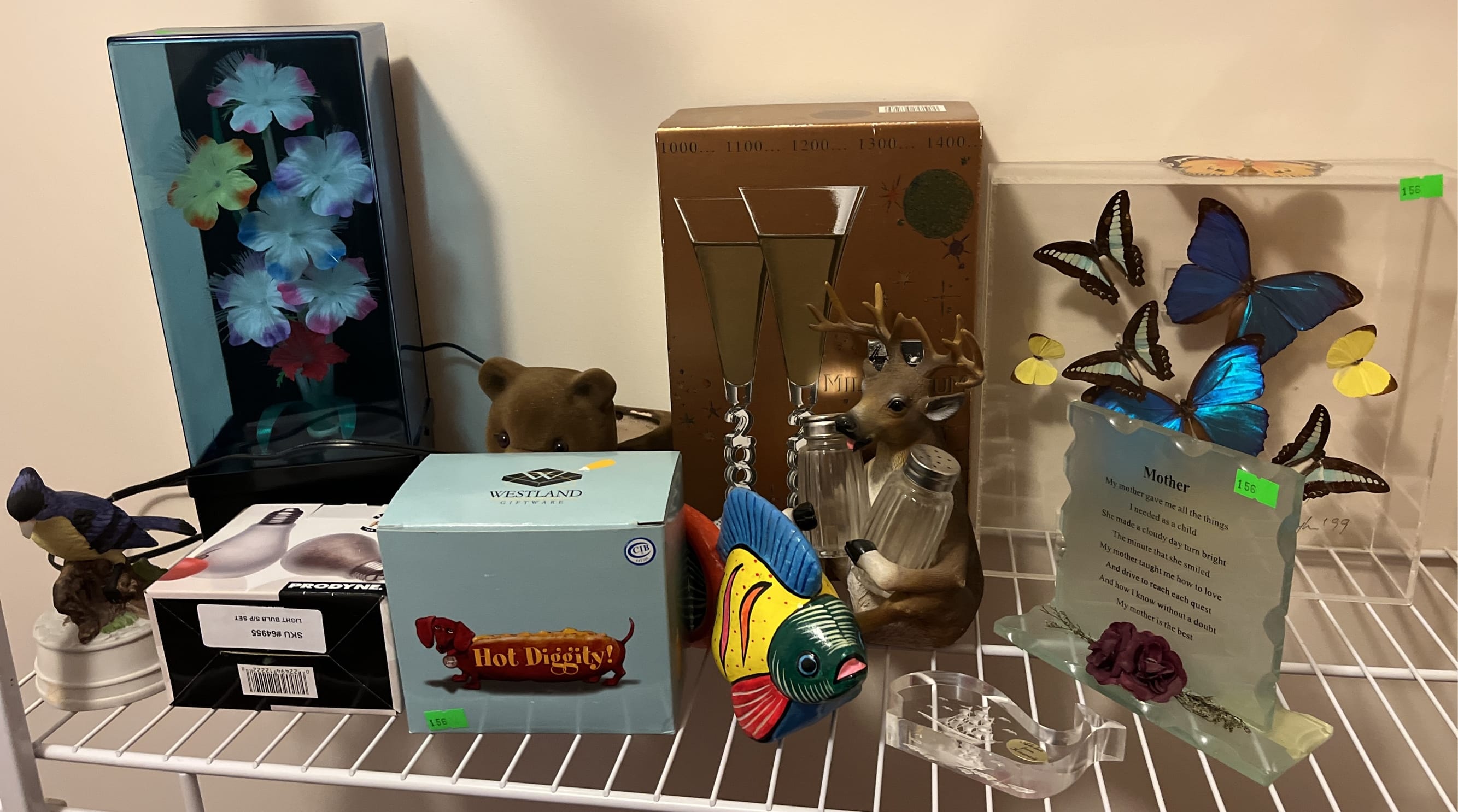 156 Salt and pepper shakers, music box, lights, Crystal champagne glasses, butterfly display, planter