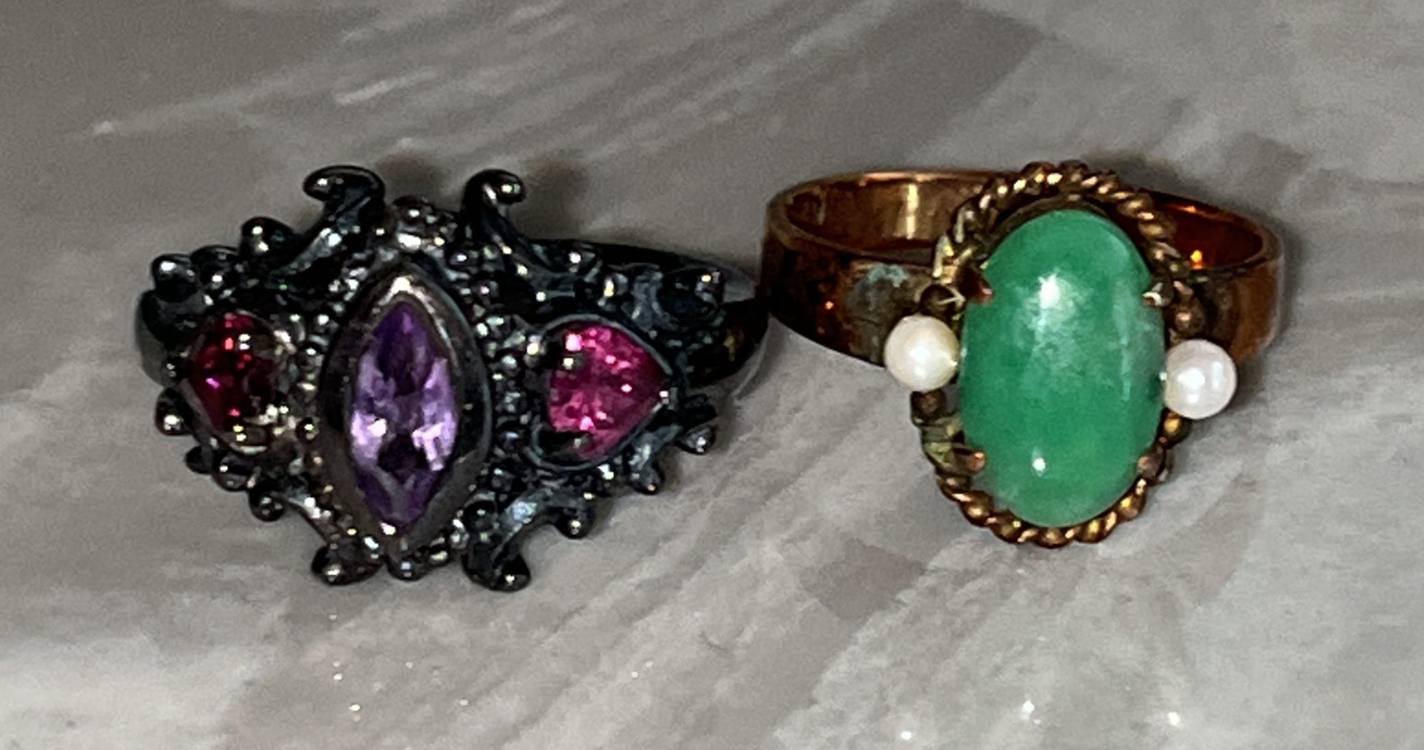 164 925 Ring with pink stones, 14kt ring with jade colored stone