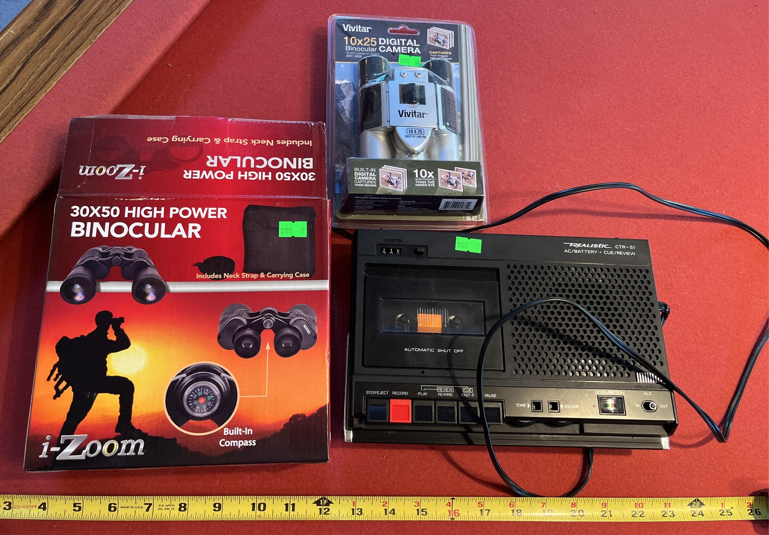 205 Realistic cassette player, Vivitar 10x25 binoculars digital camera, iZoom 30x50 binocular