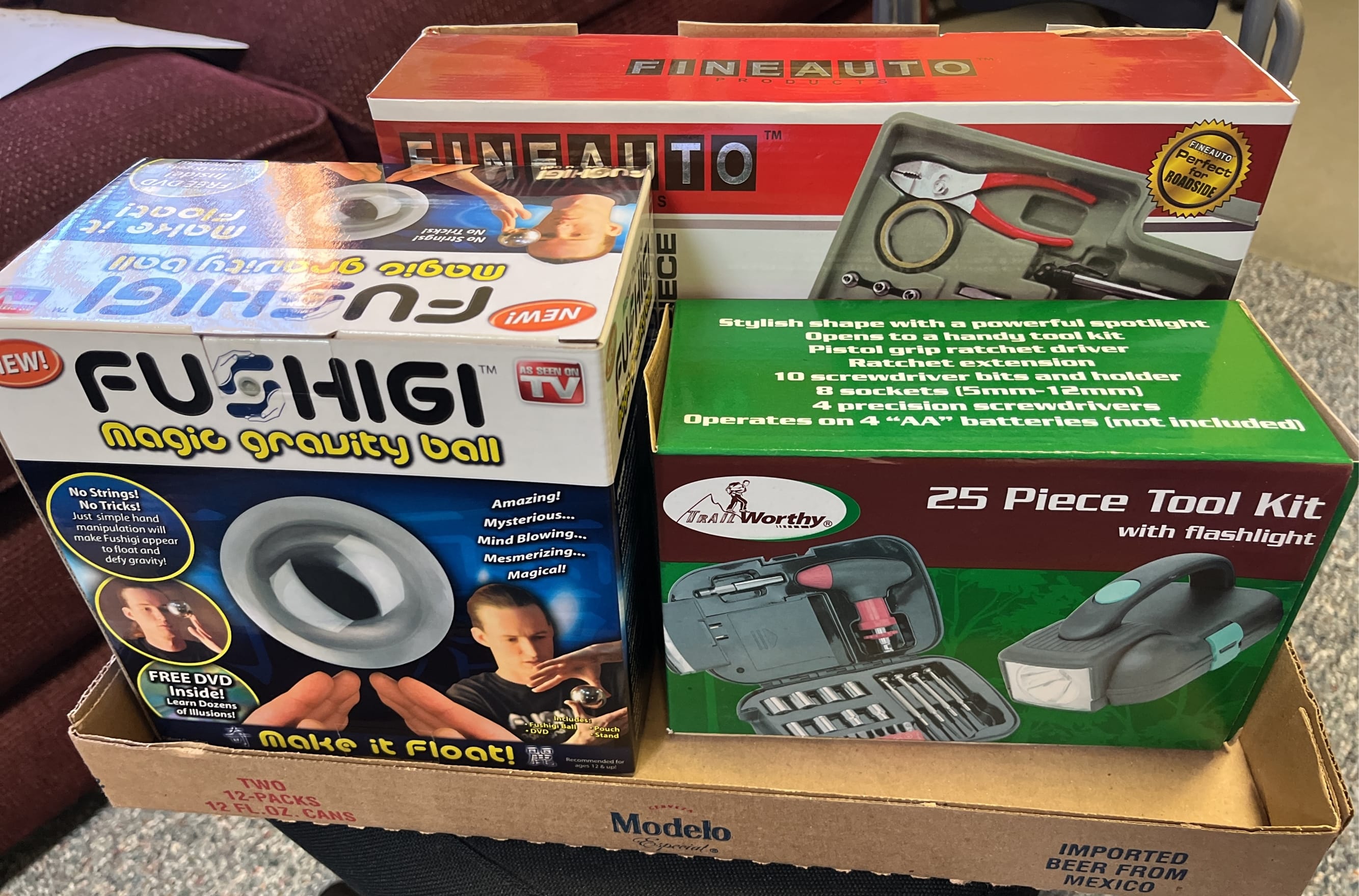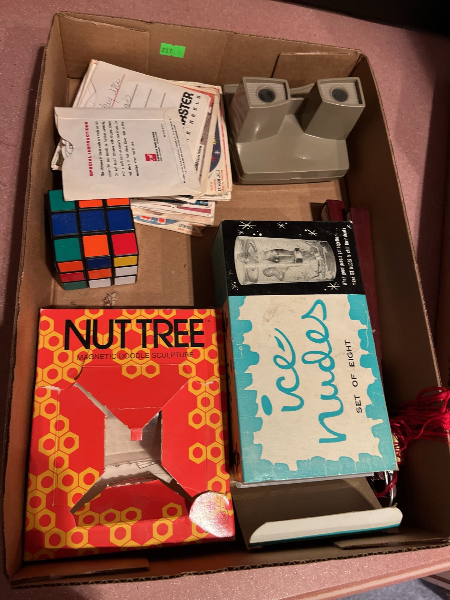 217 Rubik’s cubes, nut tree, nude ice set, hand fans, view master with picture reels