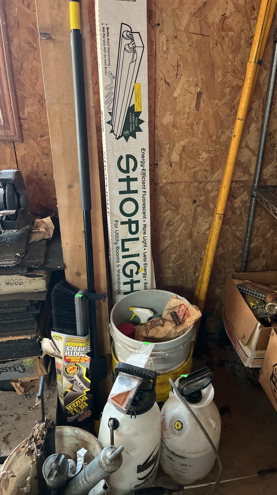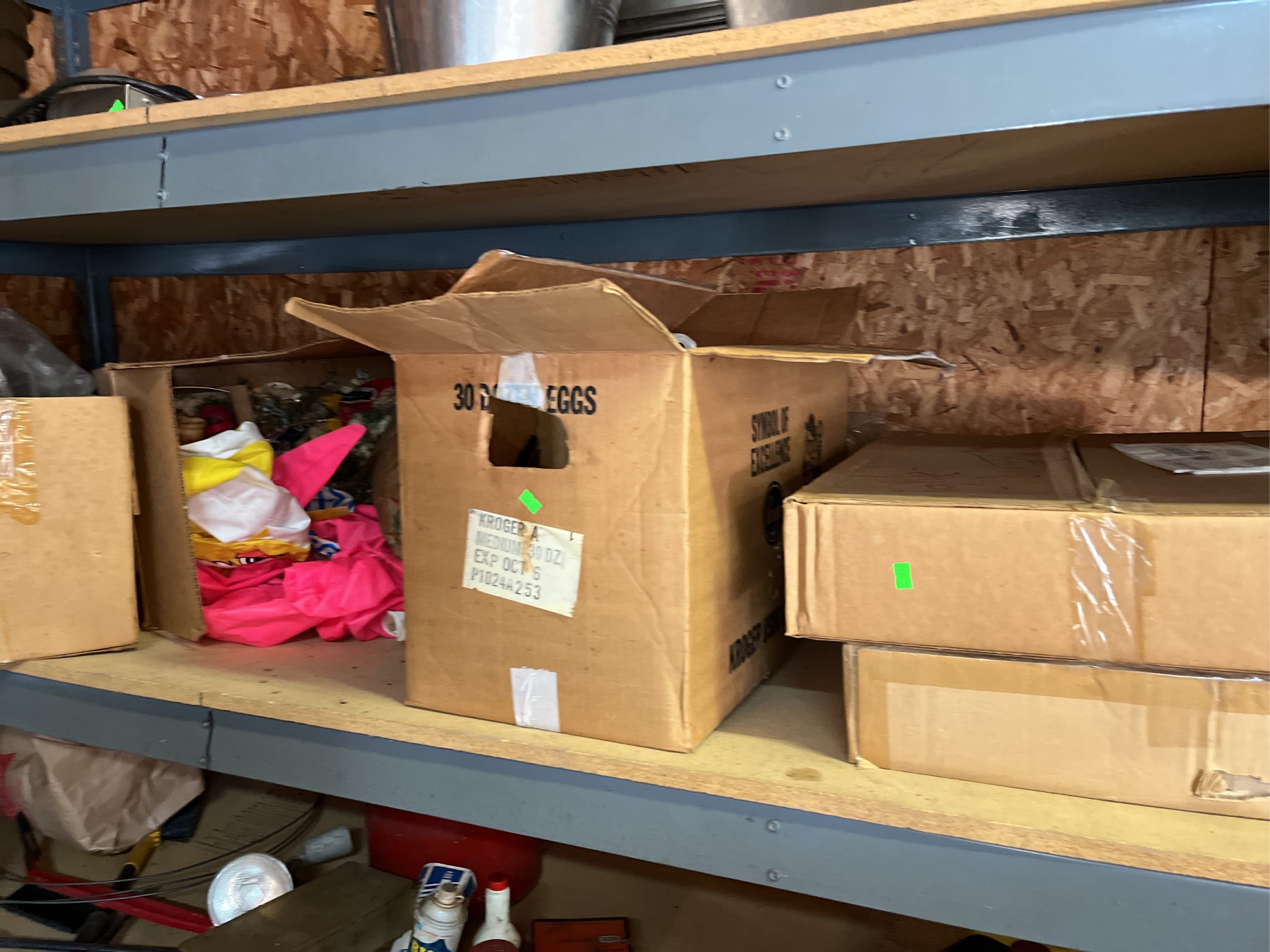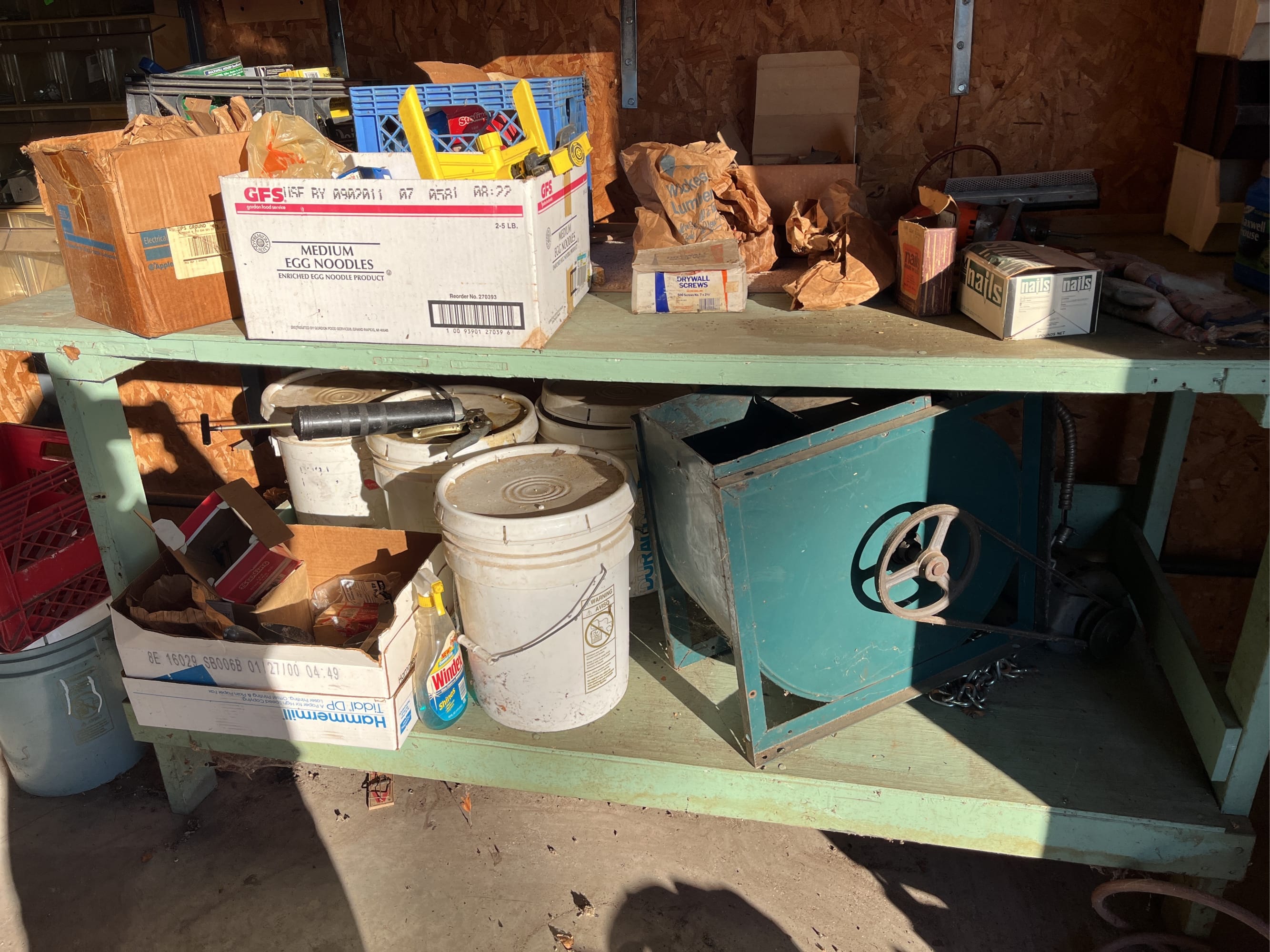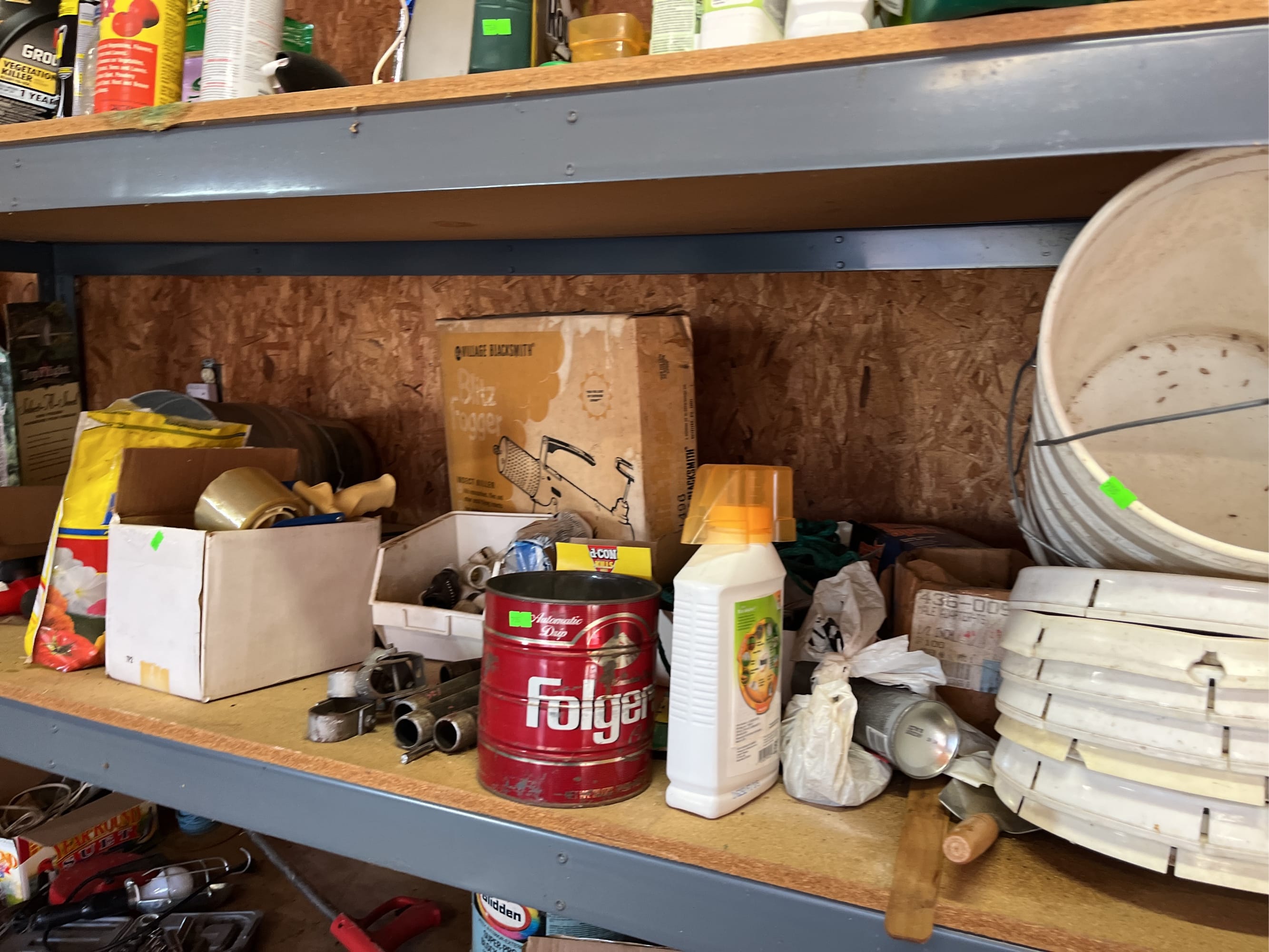 755 5 Gallon buckets, fire extinguisher, and misc. contents of shelf