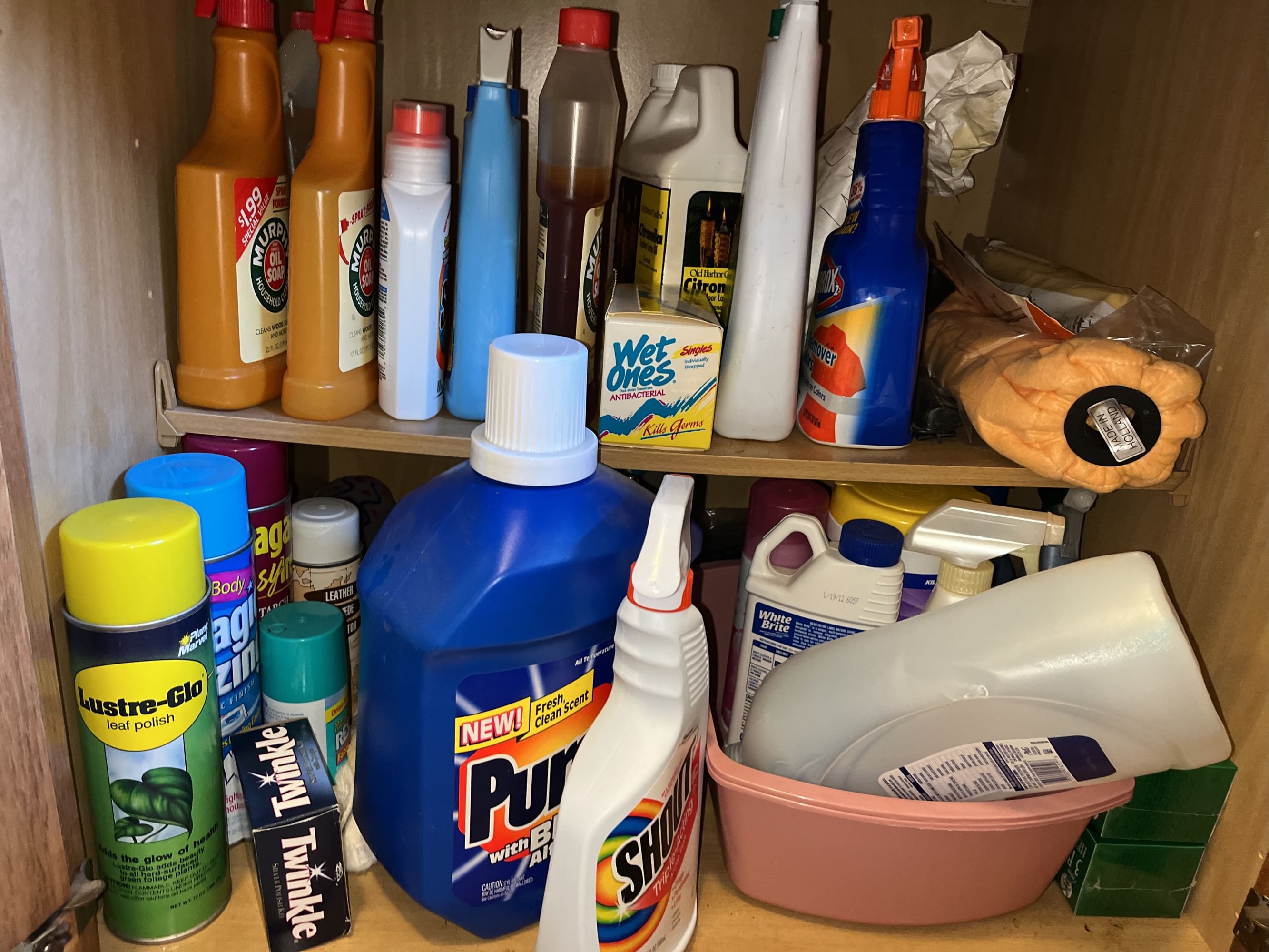 785 Wire rolling rack and contents 38x24x80" inc. paint, stain and misc