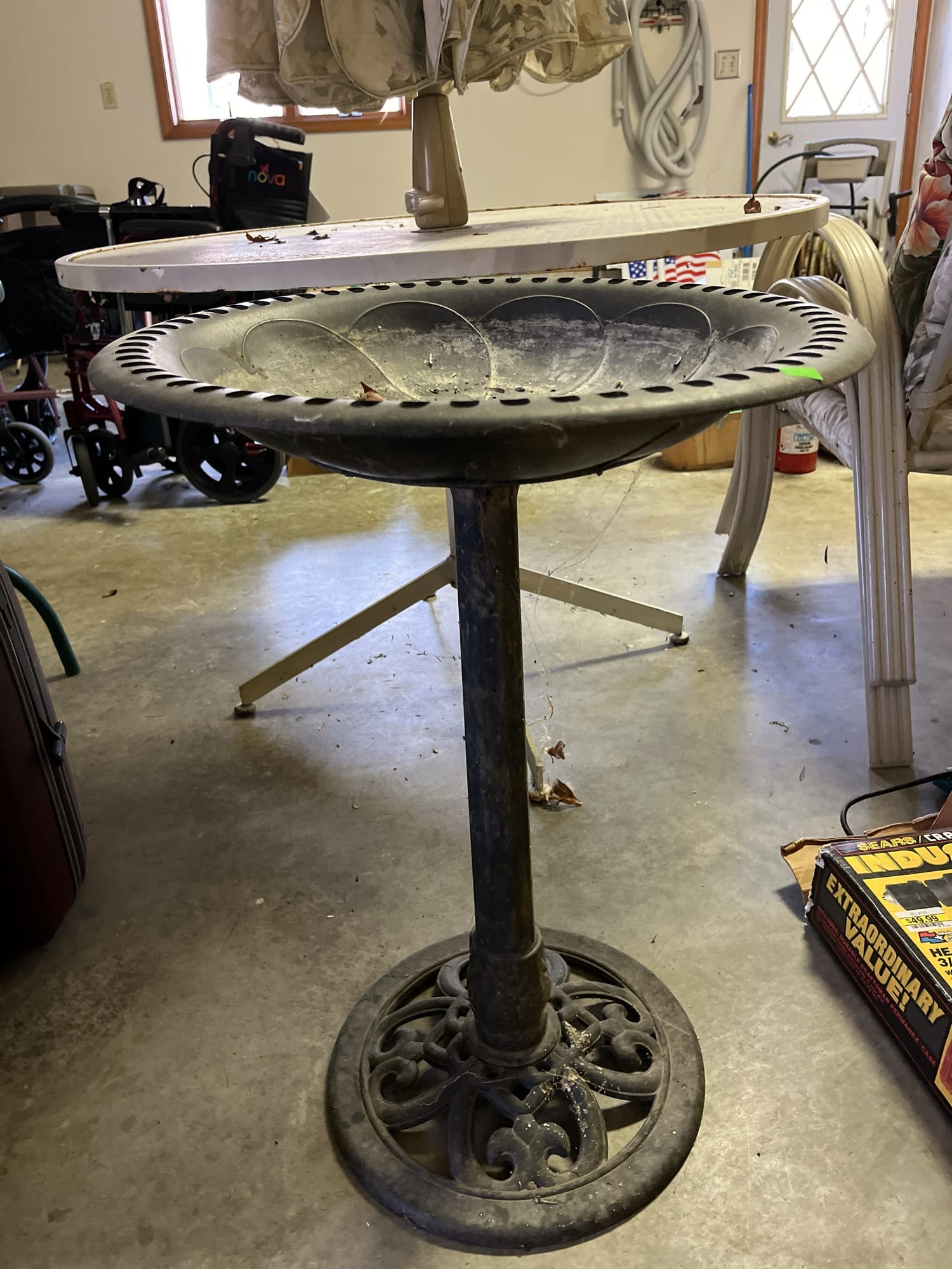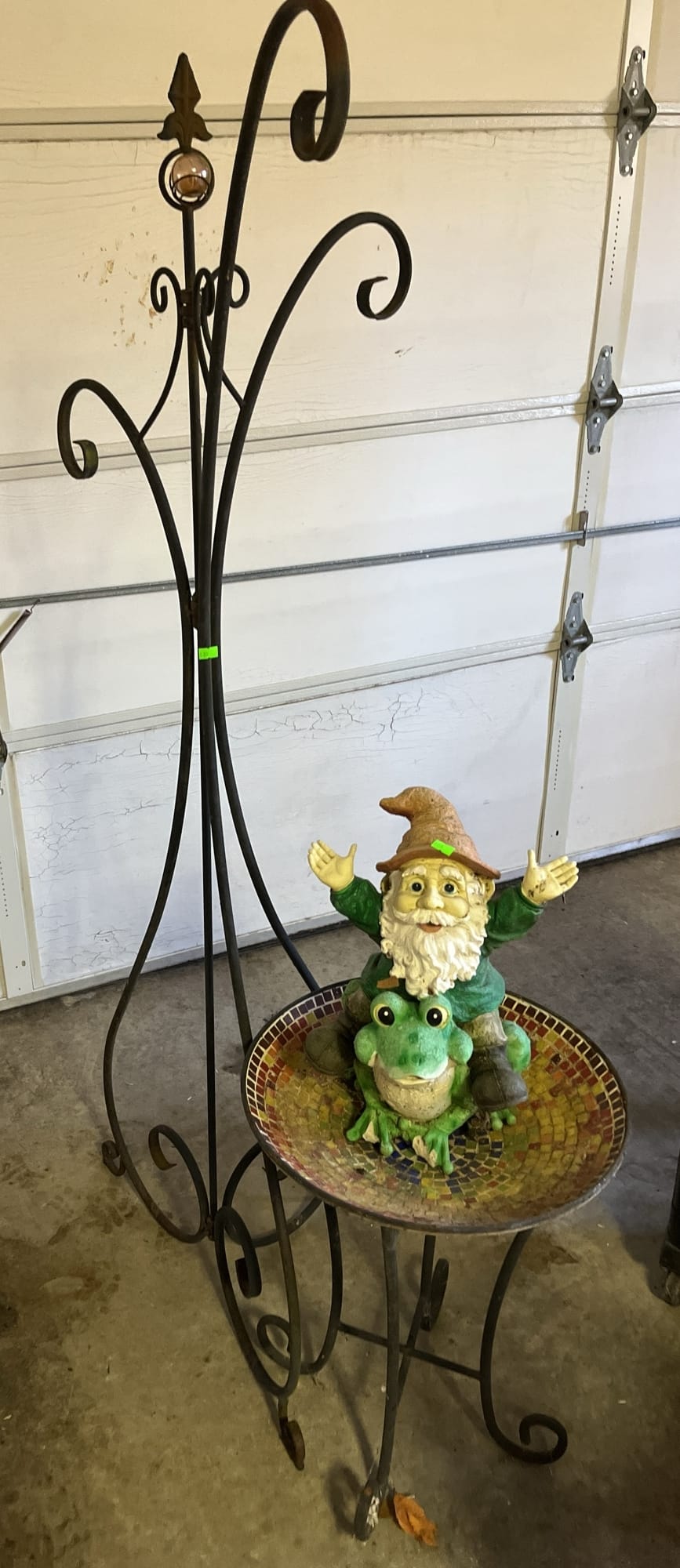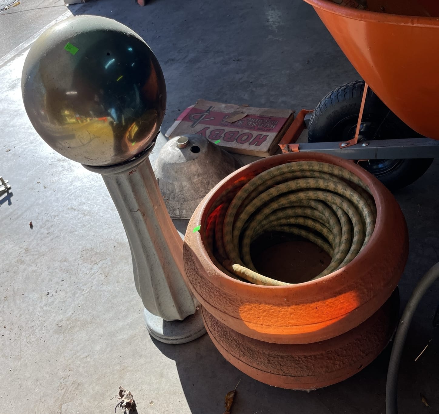 714 (2) Plastic containers with hoses, gazing ball and stand 32”