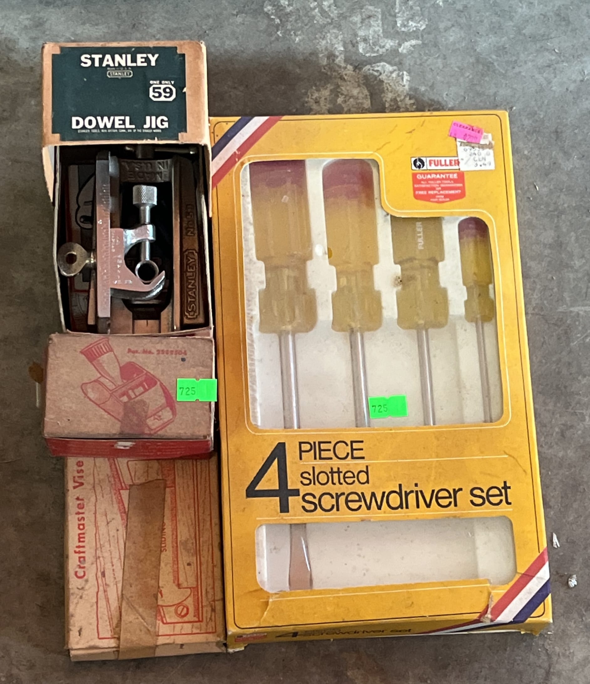 725 Screwdrivers, Stanley dowel jig, razor plane, craftmaster vise