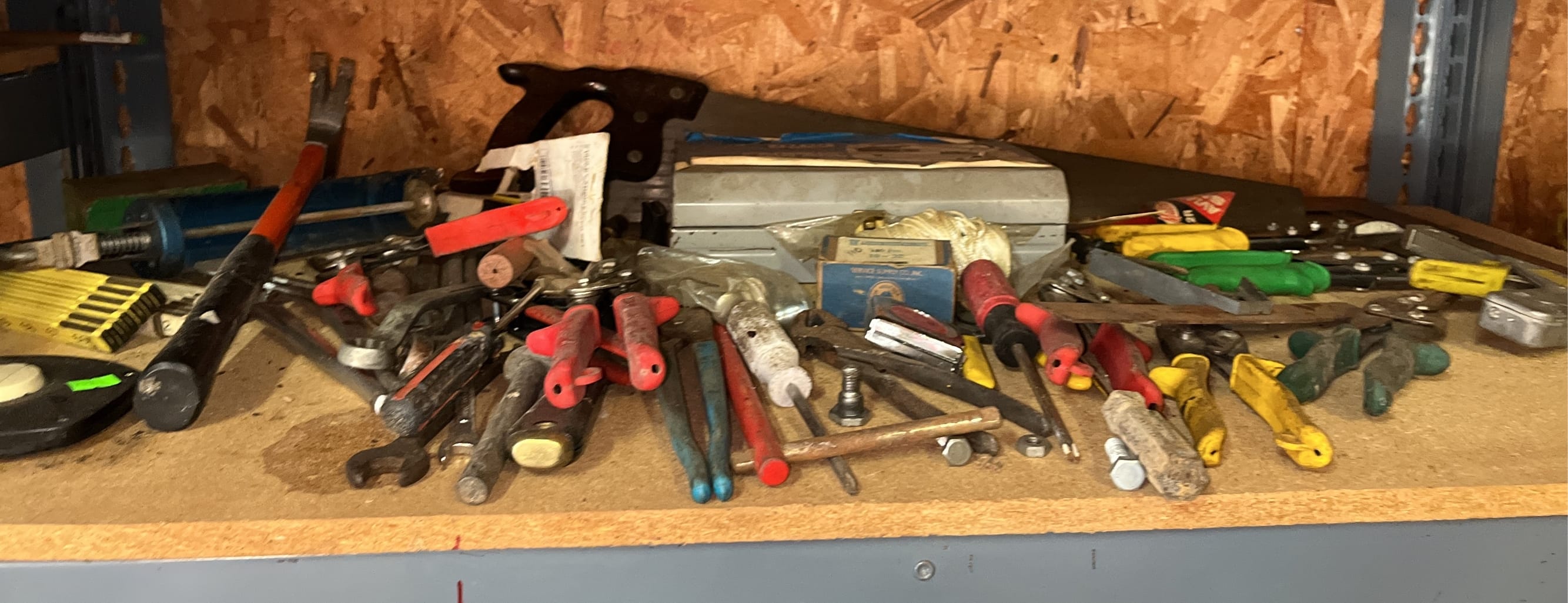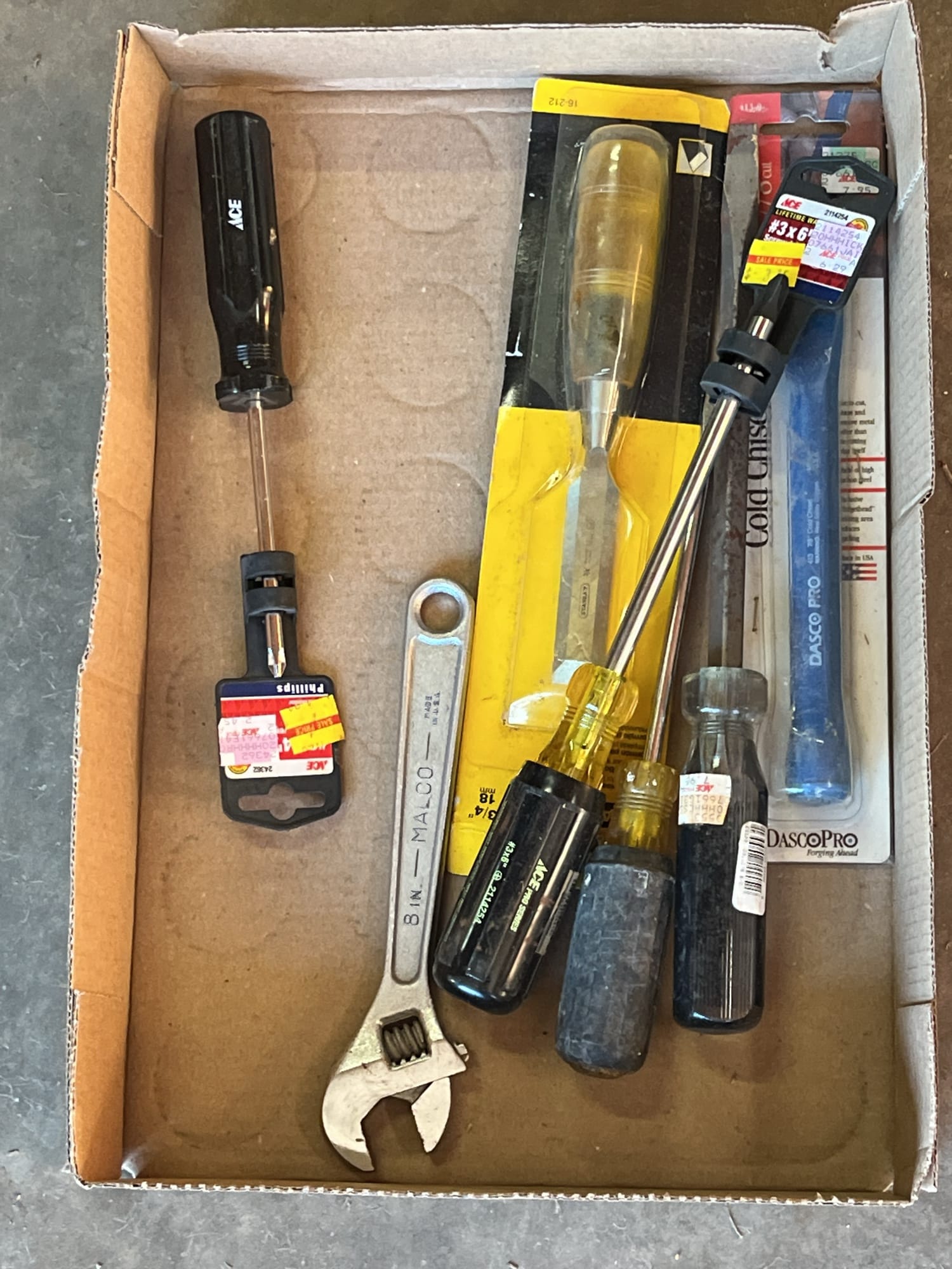 770 Tool assortment inc torch, hammer, screwdriver, hand saw and misc
