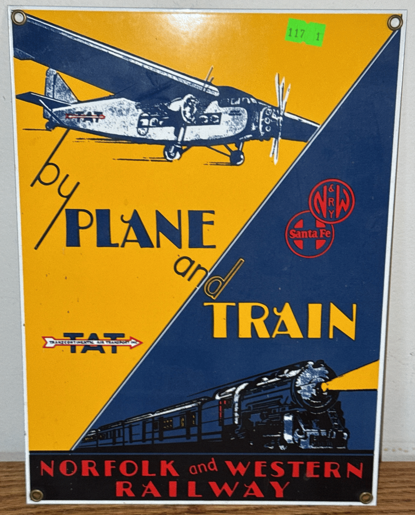 117 Ande Rooney Plane & Train Sign, porcelain in steel advertising sign 9 1/2x13