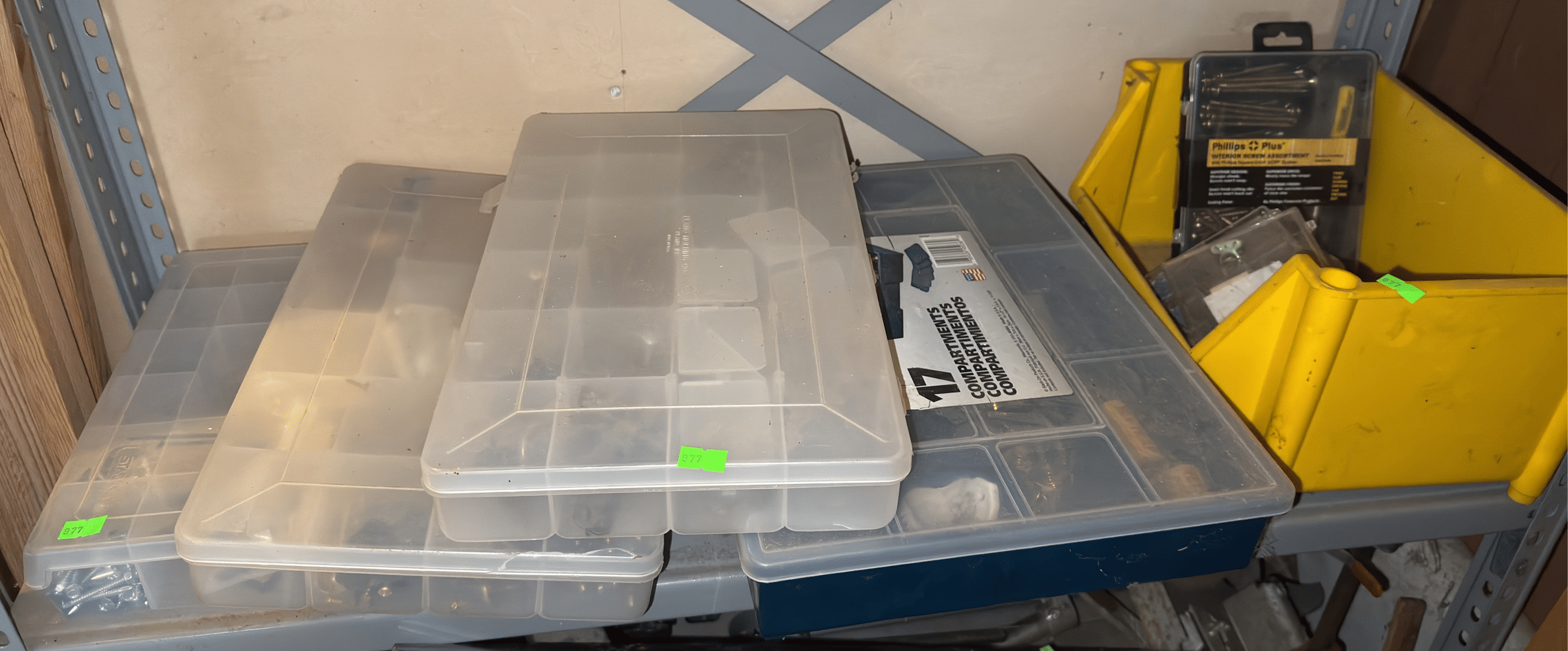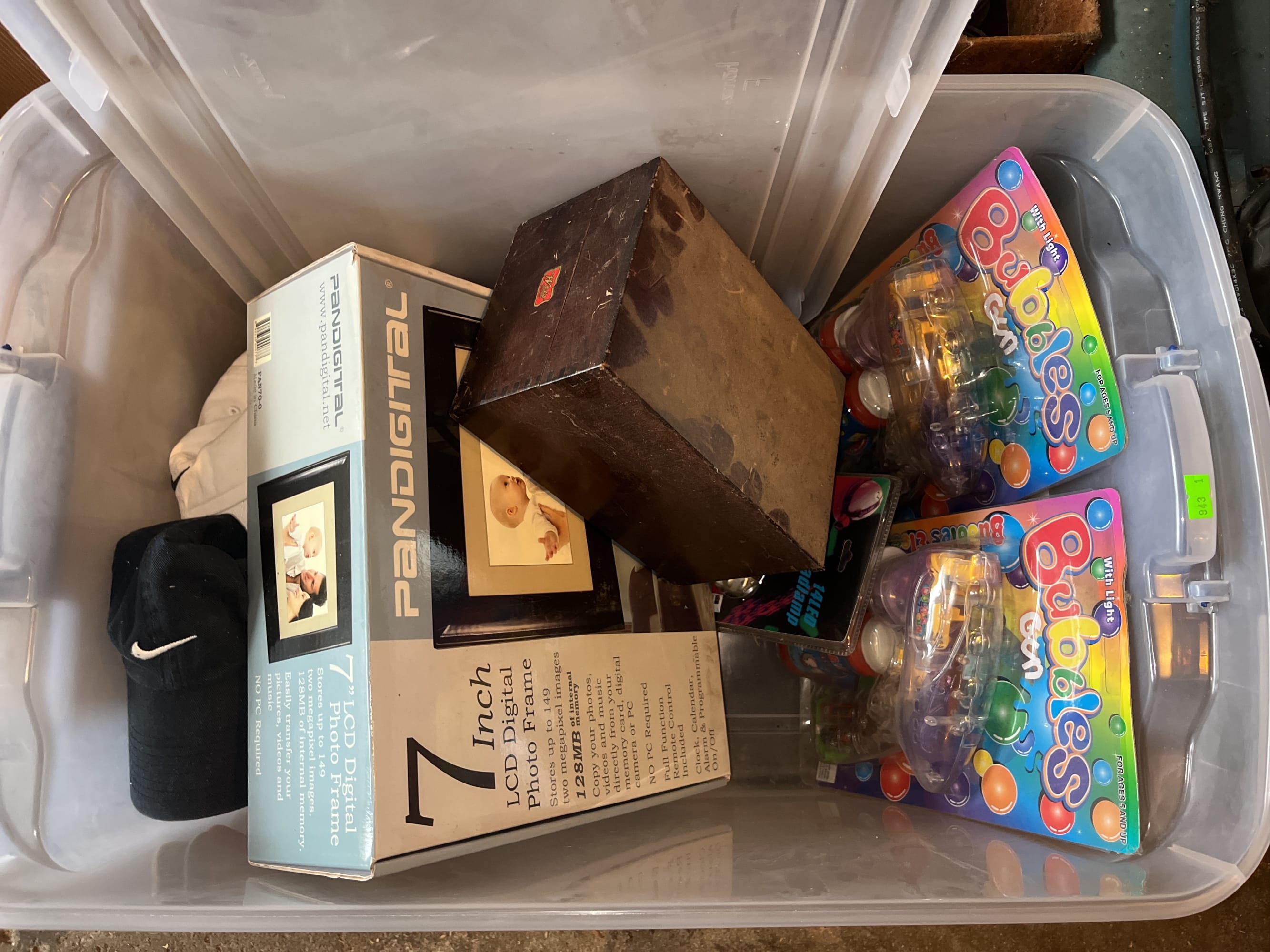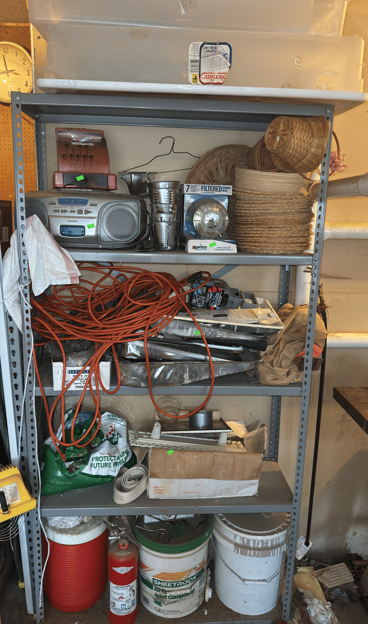 971 Aiwa radio/cassette player, metal toy cash register, extension cord, paint trays, fire extinguisher, totes - CONTENTS OF SHELF ONLY