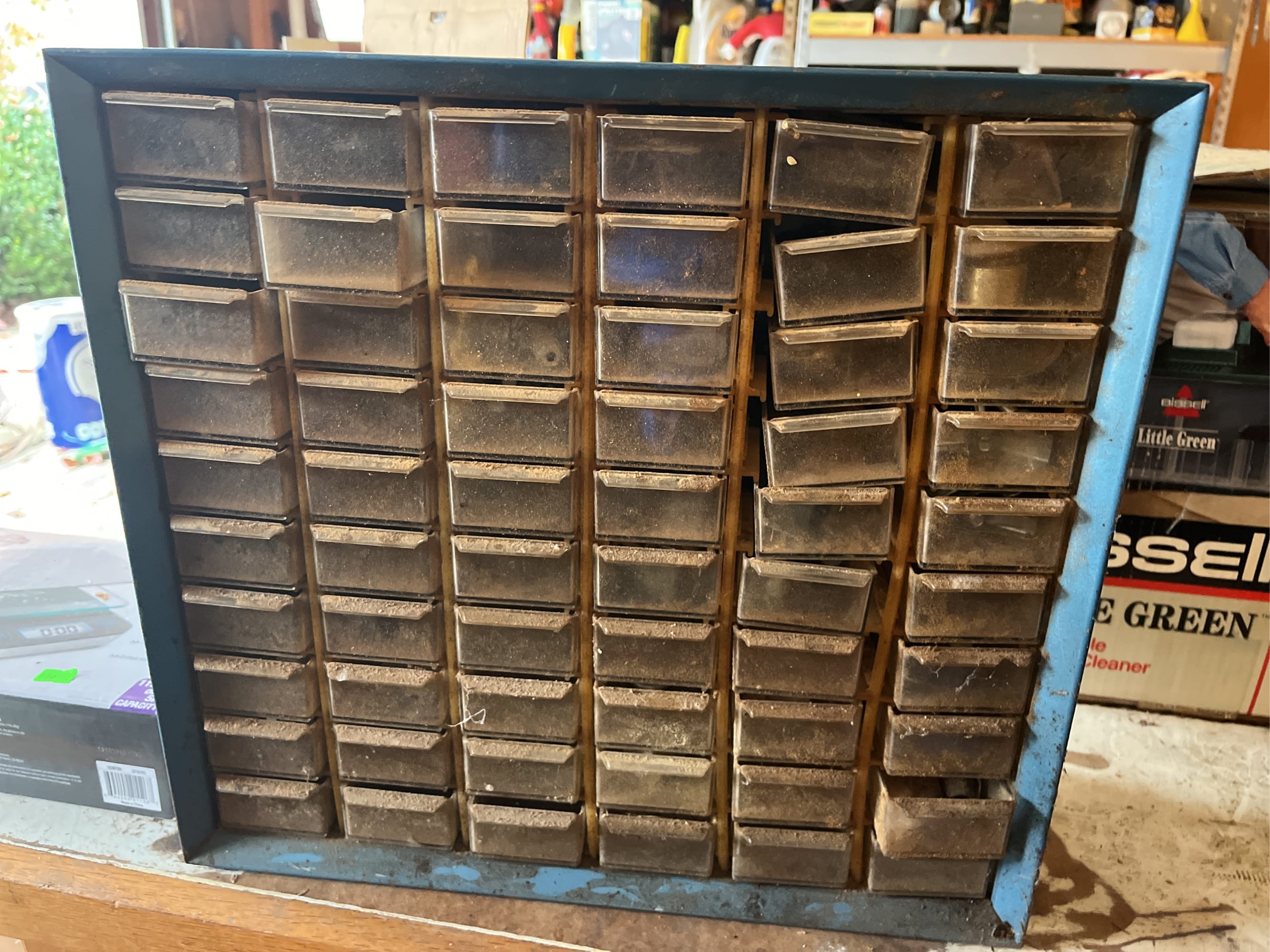 1002 Metal chimney cabinet and contents inc. extension cord, electrical plate covers and boxes, hardware, misc. 14x11x64