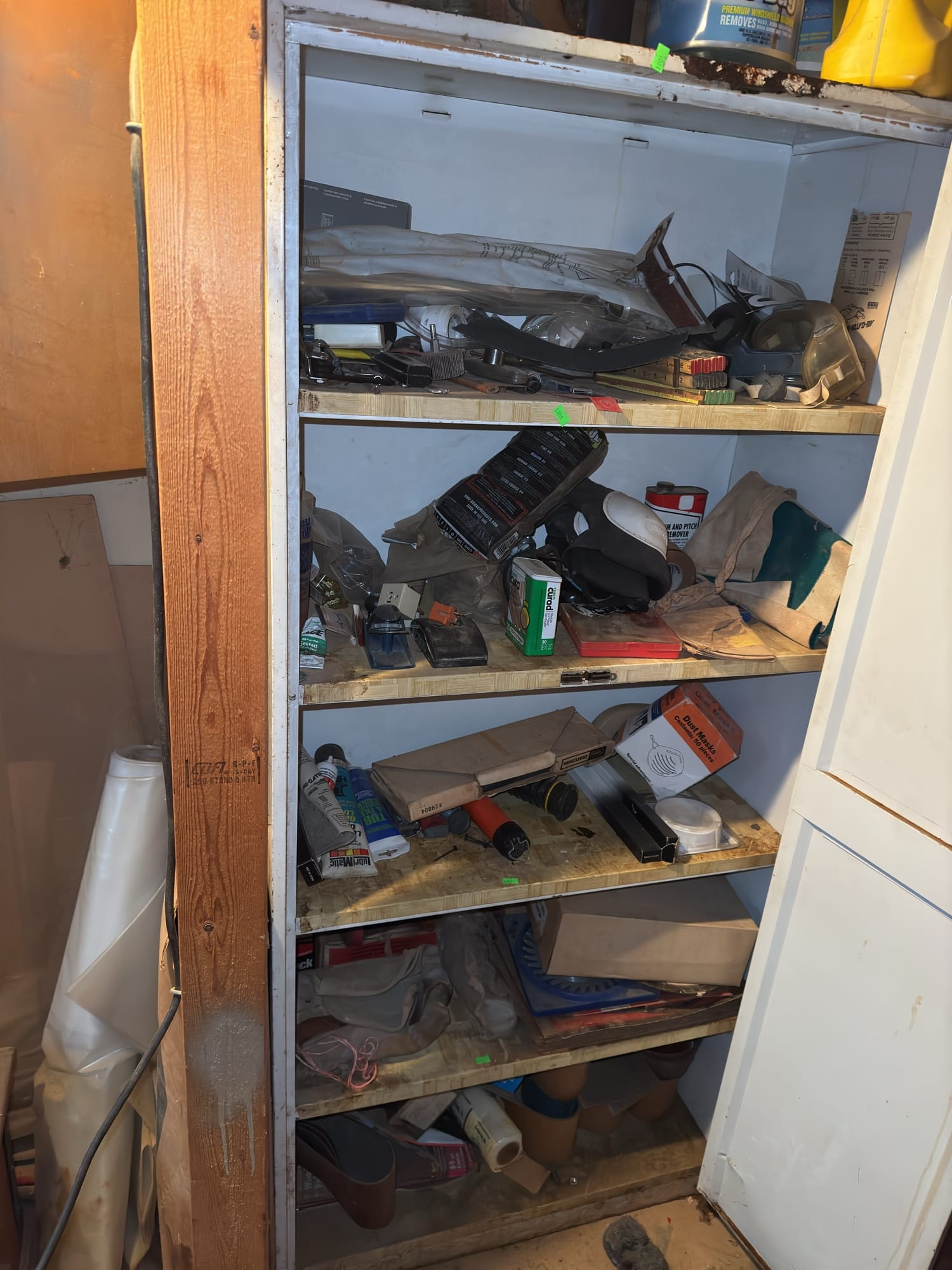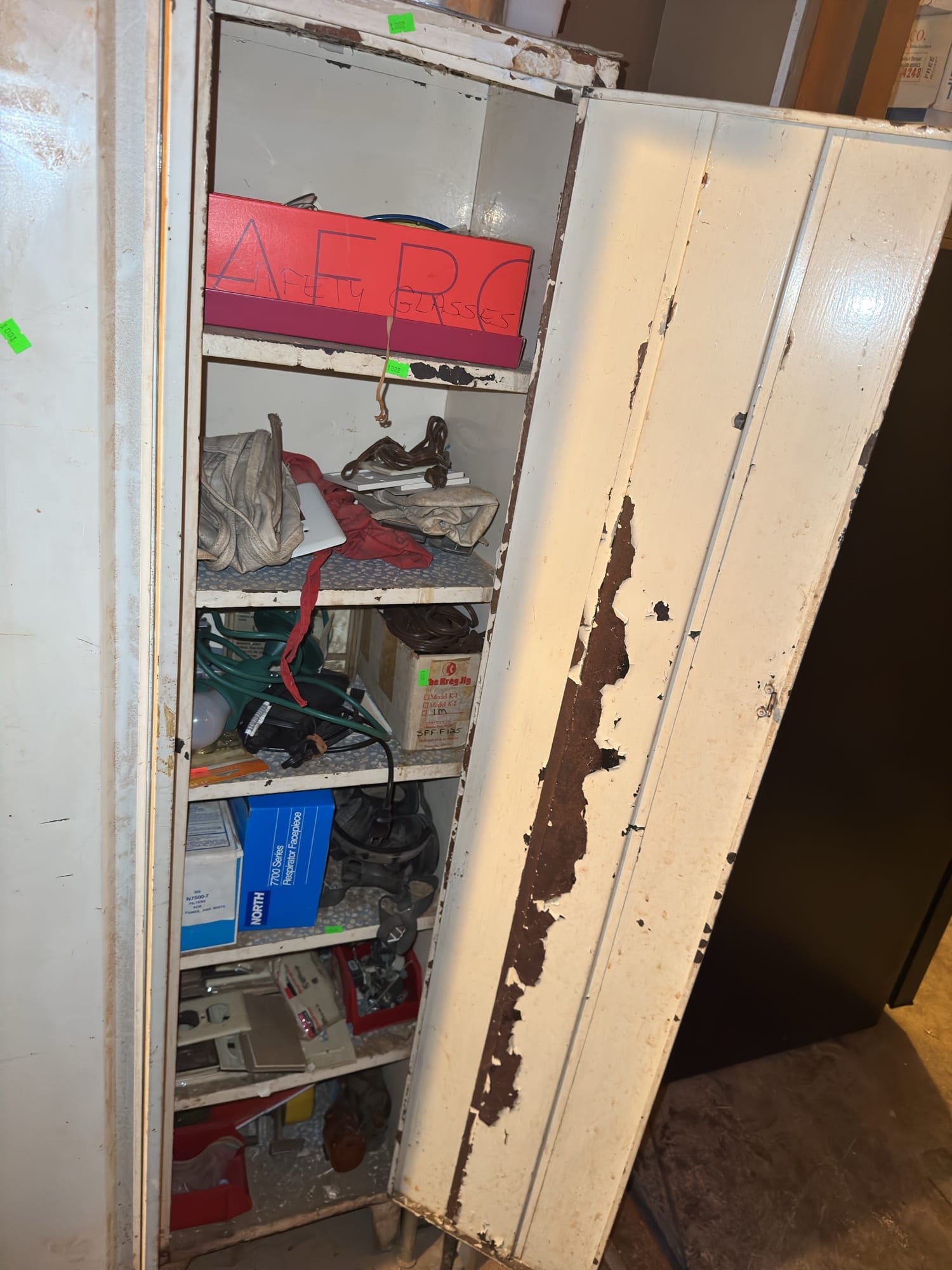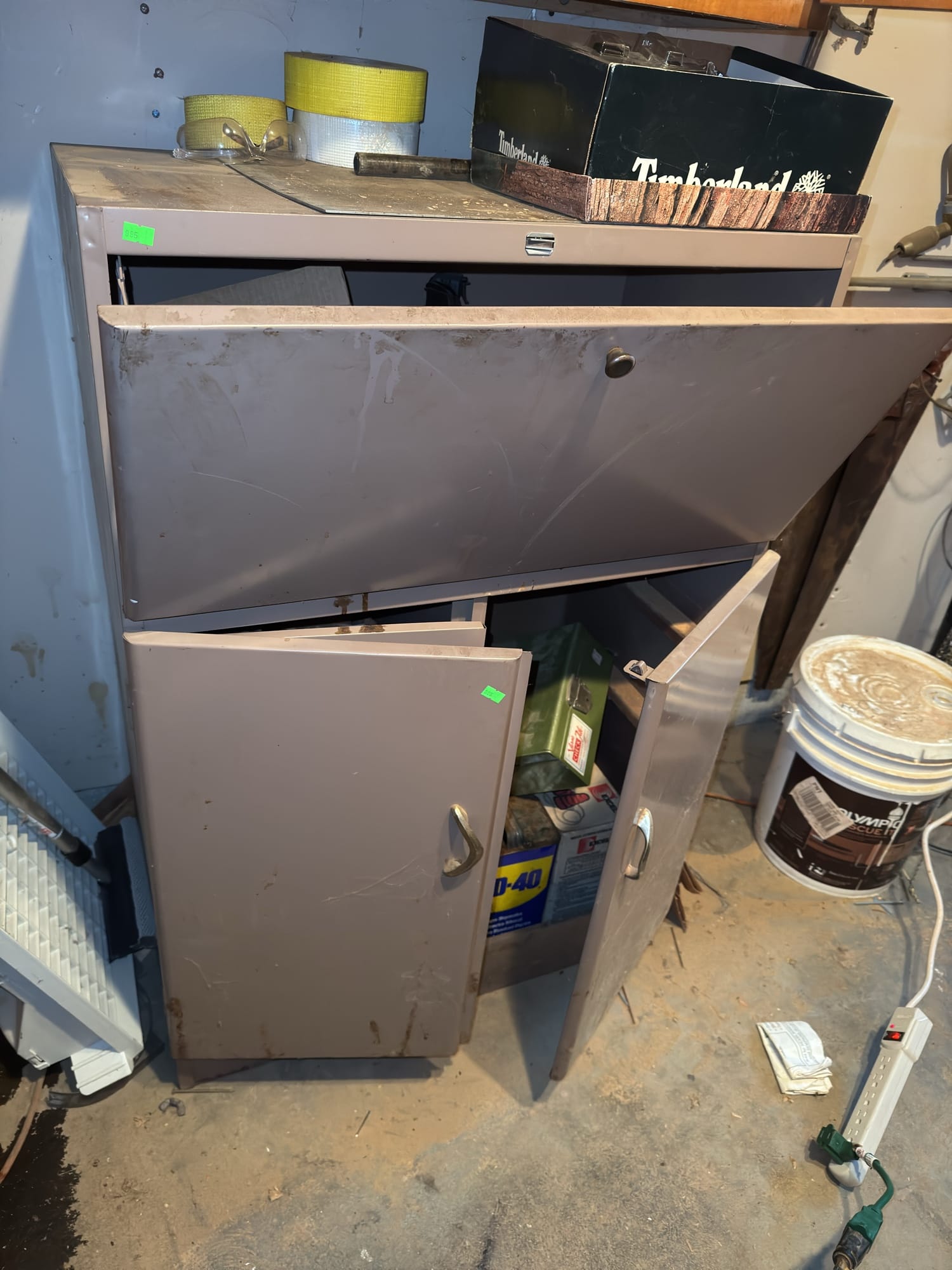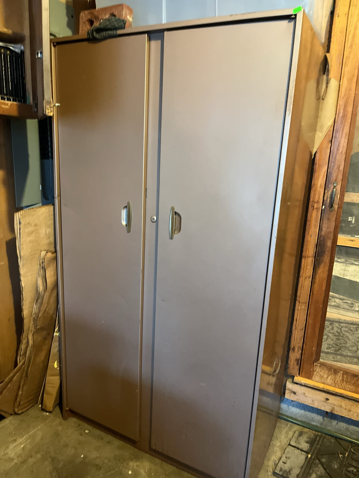 1001 Metal cabinet with contents inc. oil, sand paper, tools, misc. 30x15x66