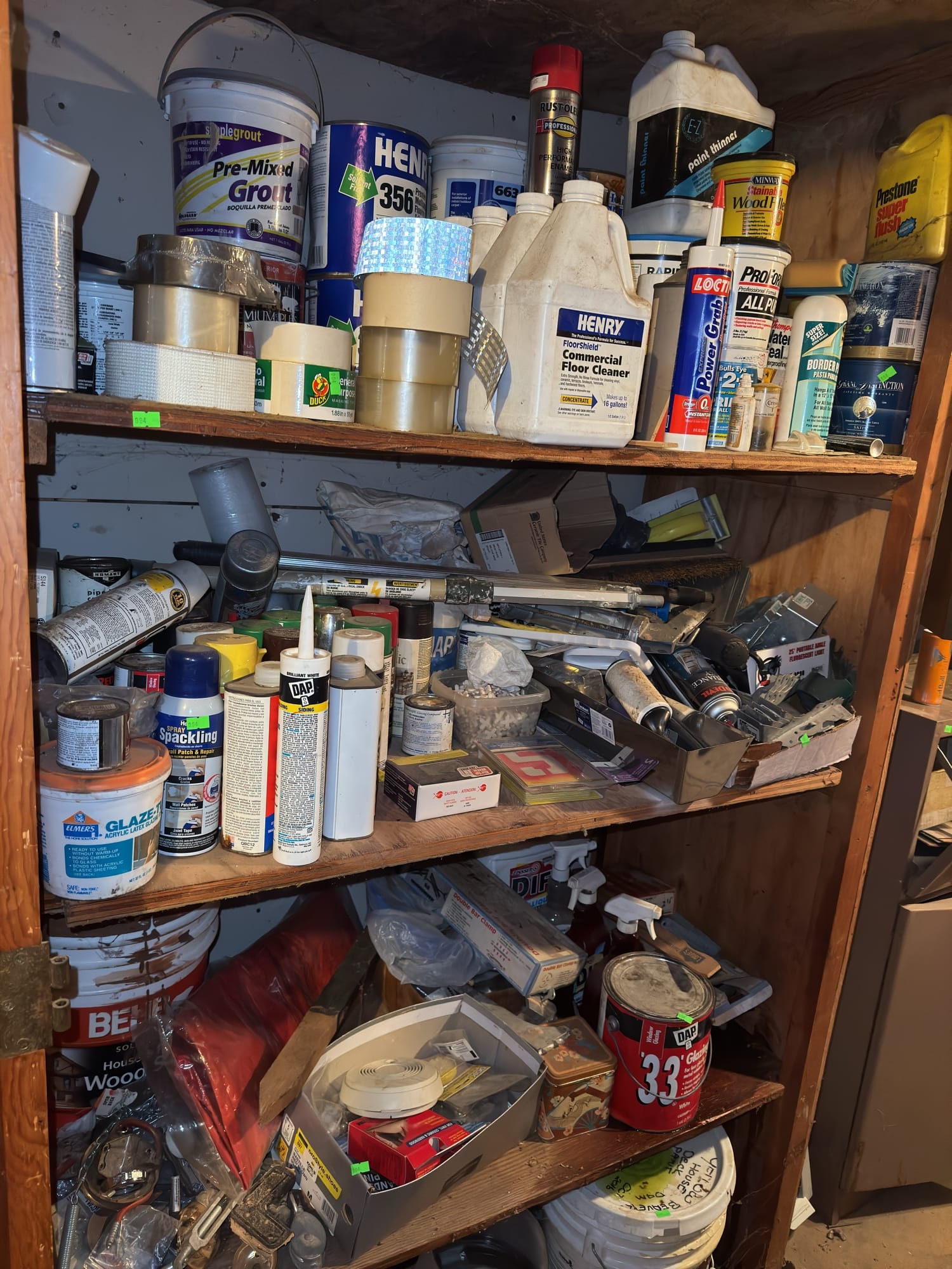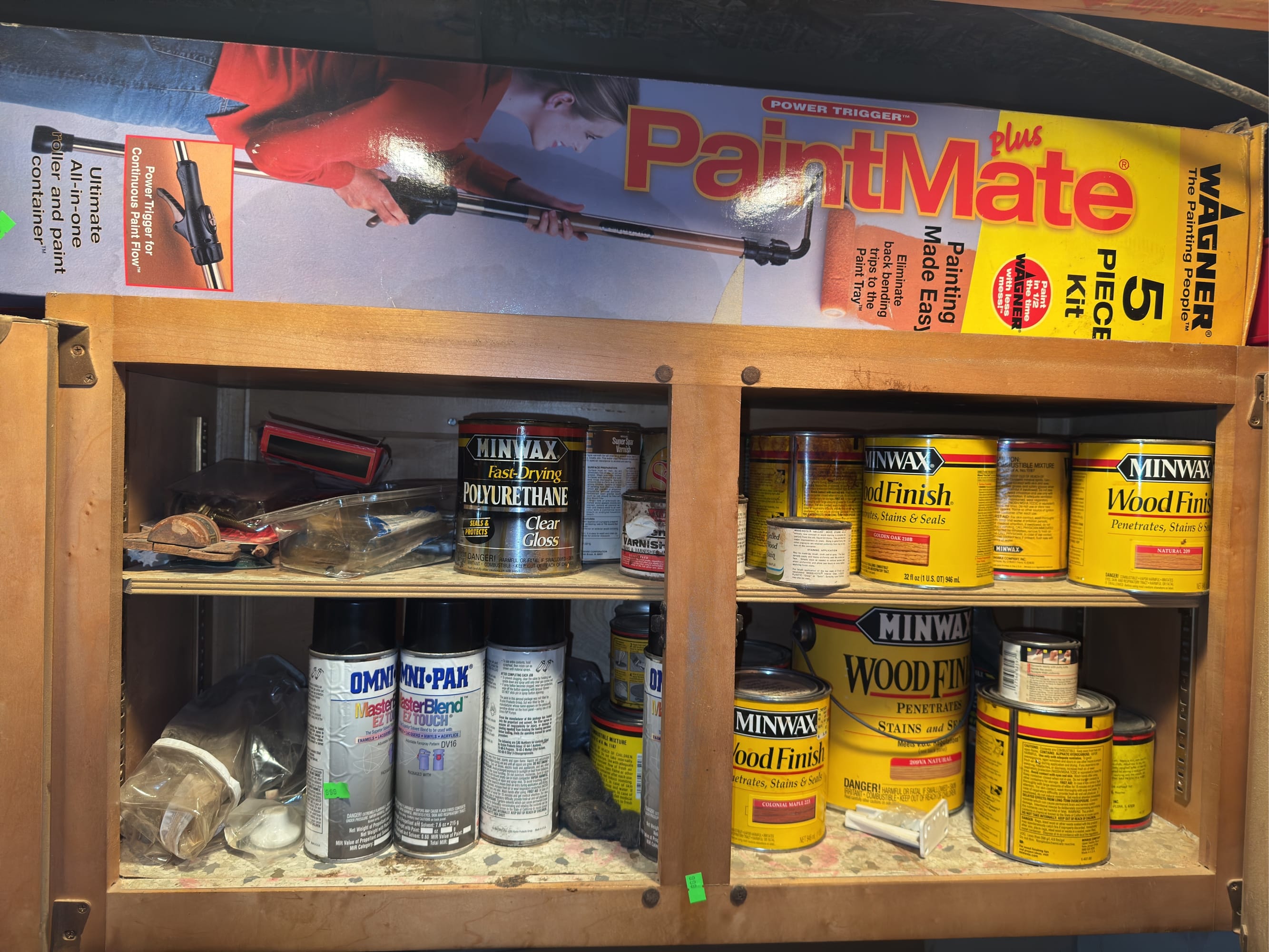 994 Paints, wall and painting supplies, miscellaneous contents of shelves