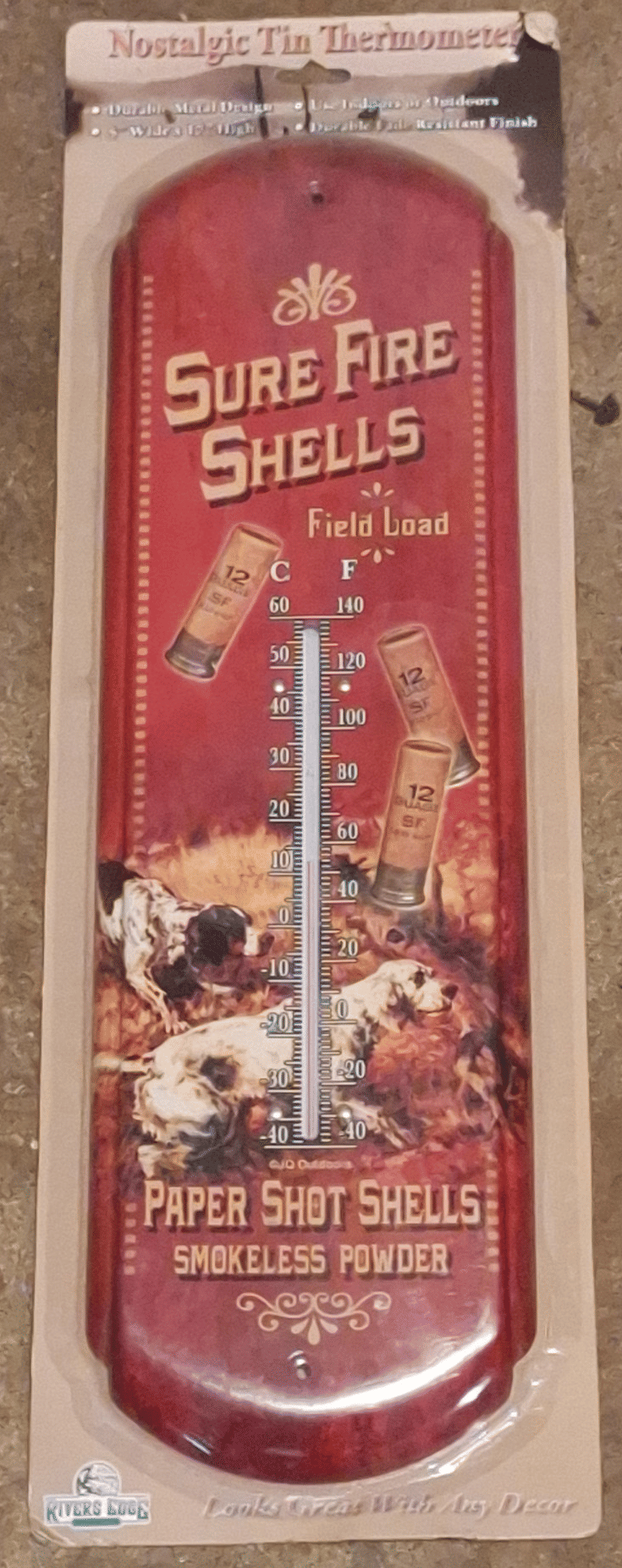 1004 Sure fire shells tin nostalgic thermometer 17in