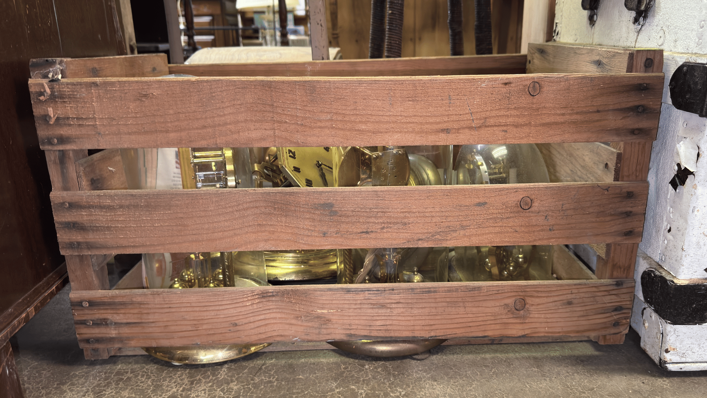114 Anniversary clocks and parts in crate