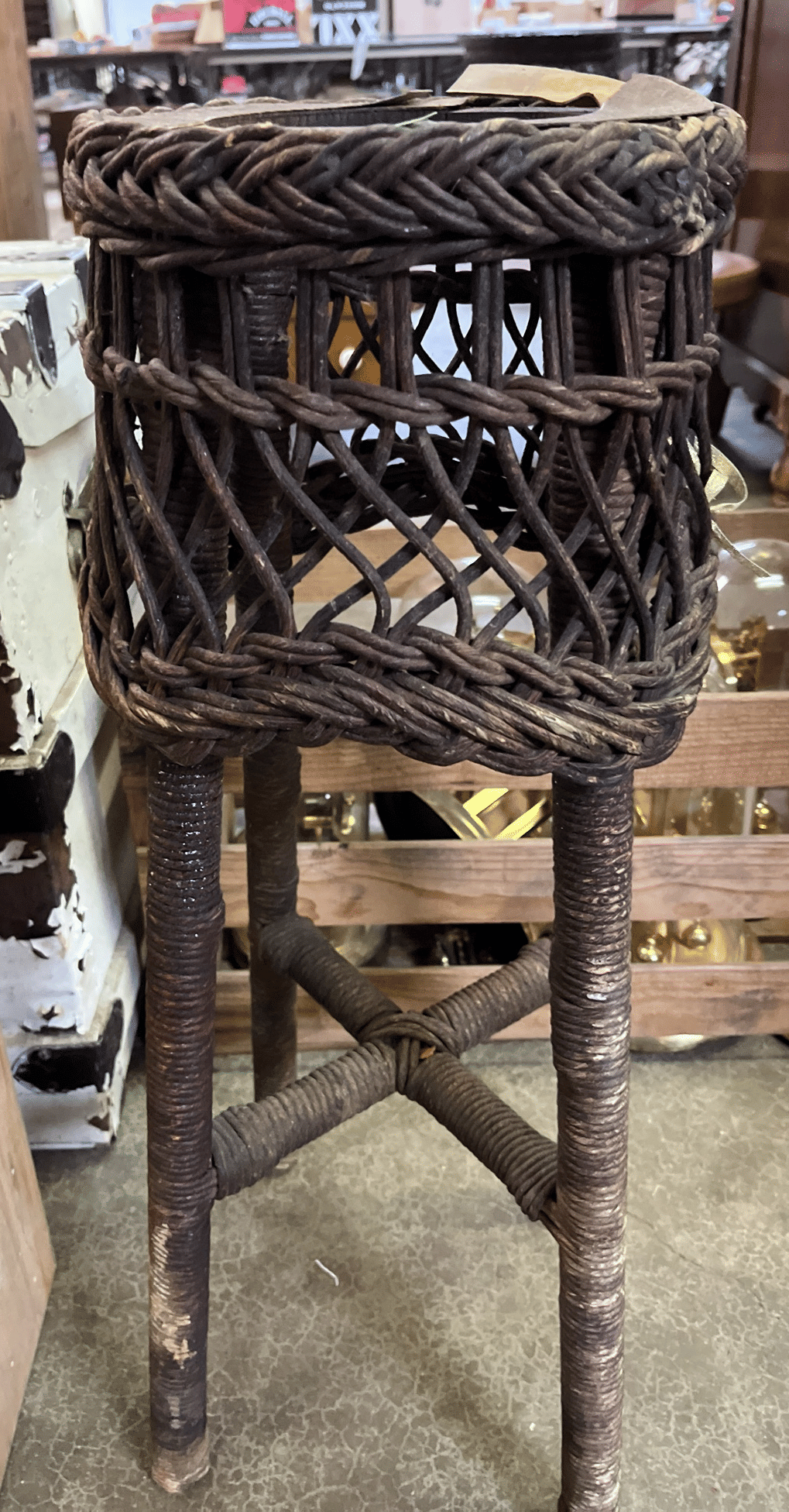 130 Wicker plant stand (has damage) 26”