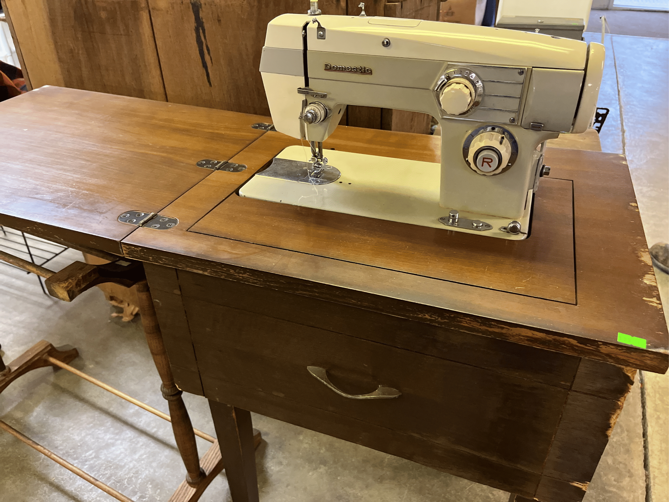 133 Domestic sewing machine with cabinet (cabinet has damage) 22x17 1/2x31