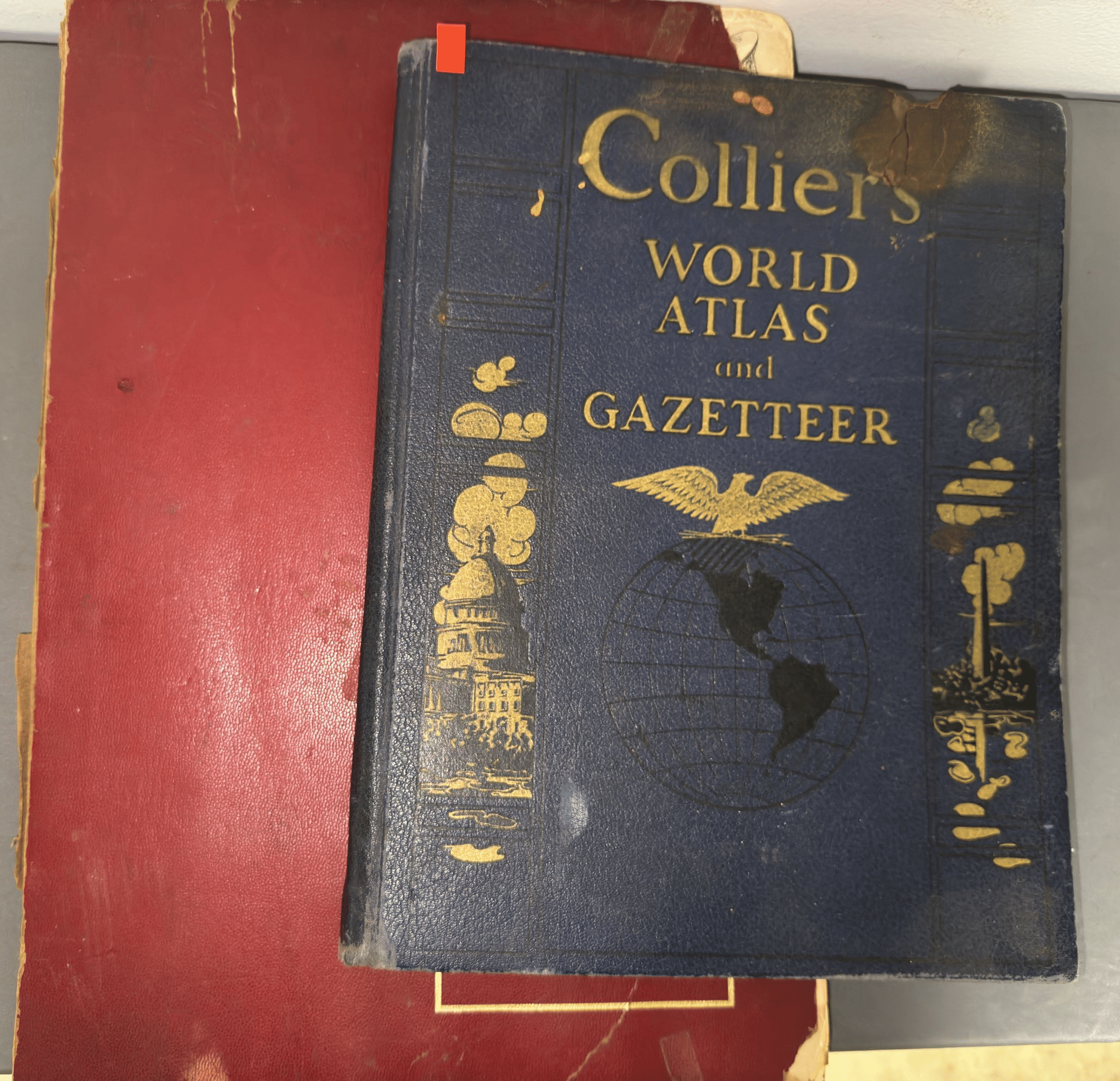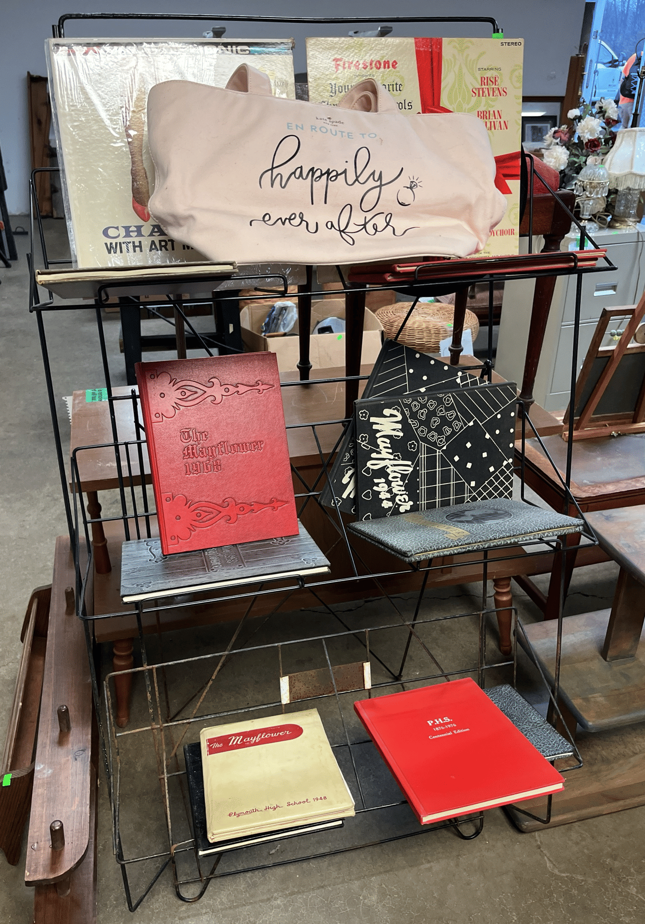 141 Wire rack 28x23x54 with records, Plymouth yearbooks