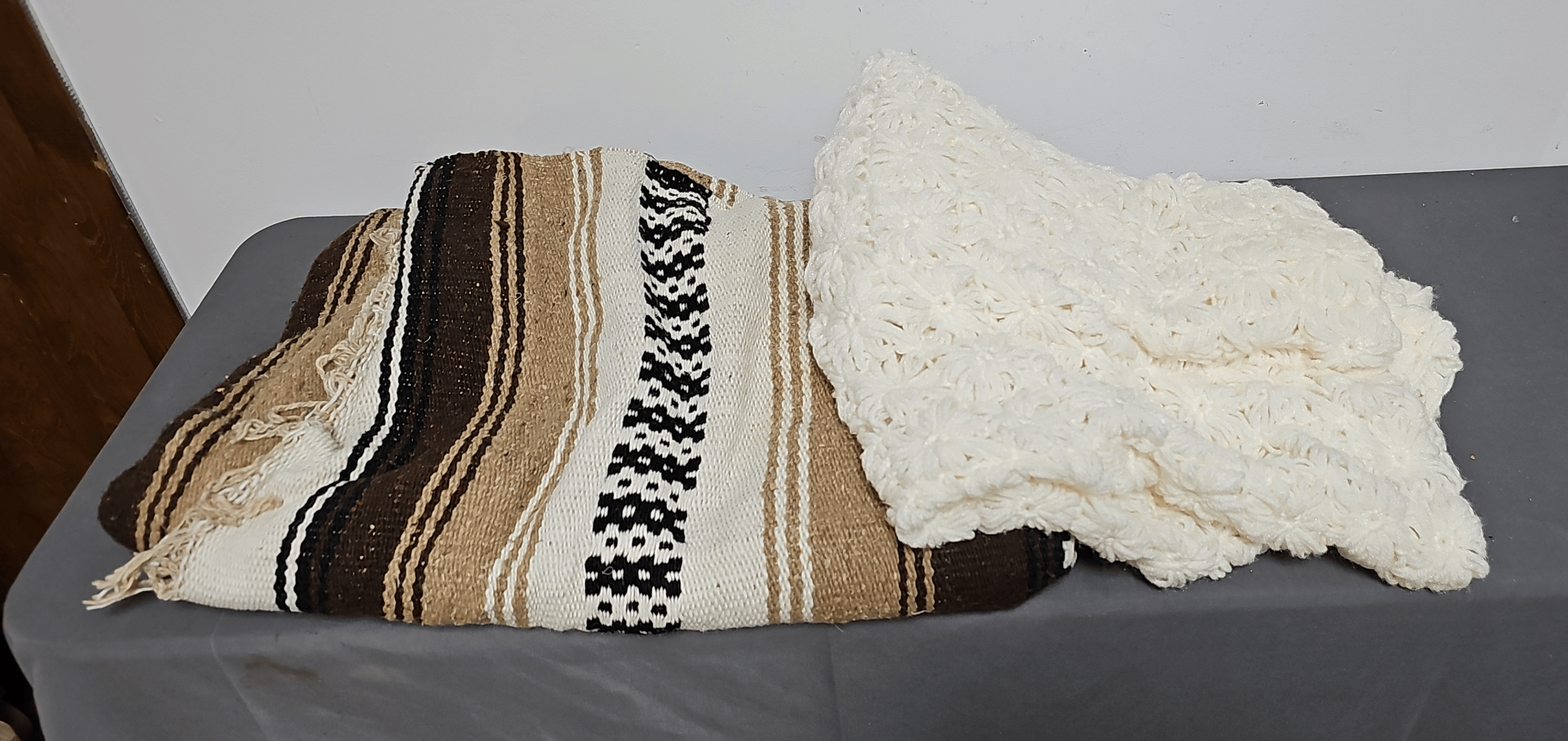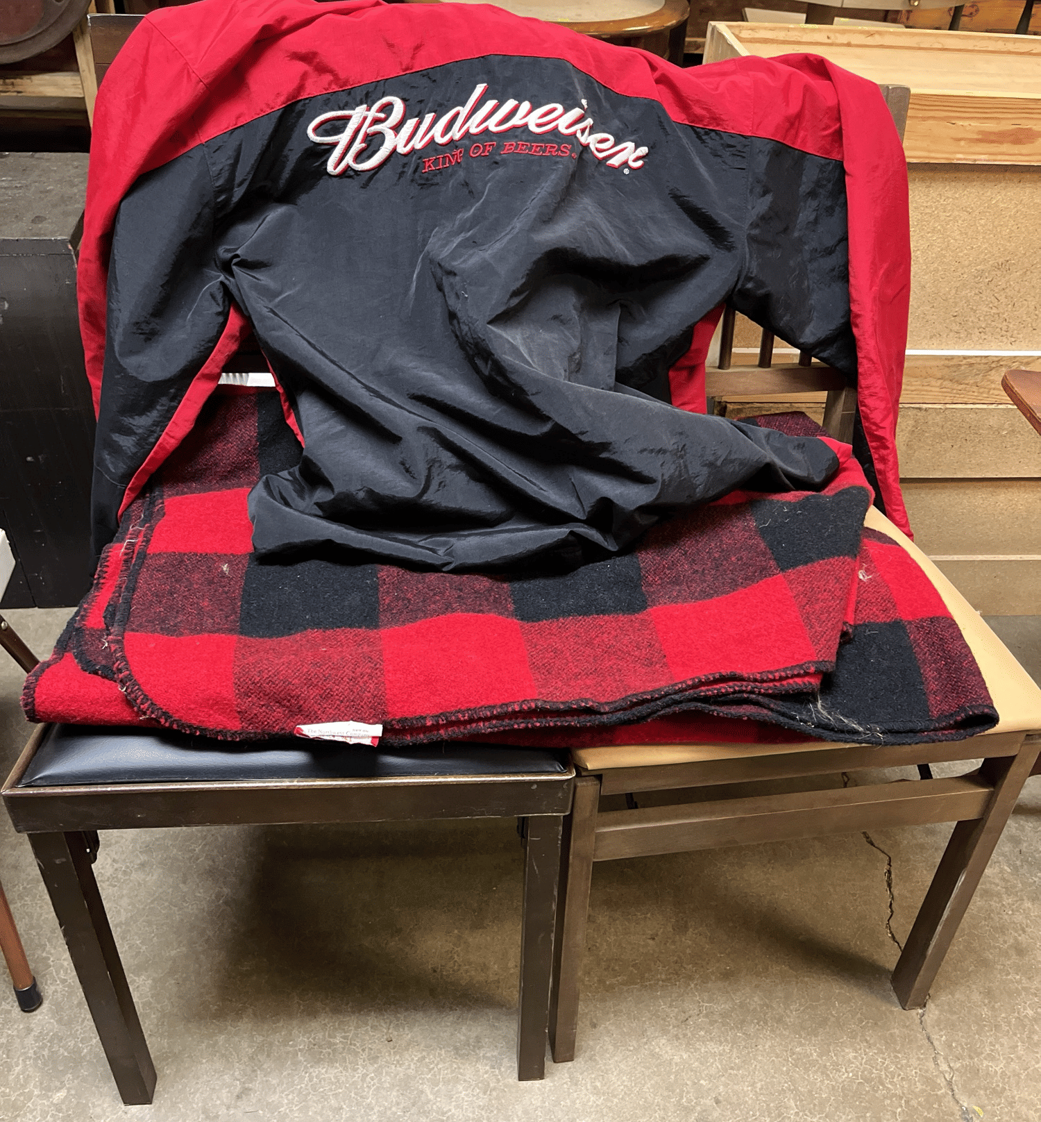 148 2 Folding wood chairs, Budweiser jacket size XL and Marlboro wool blanket