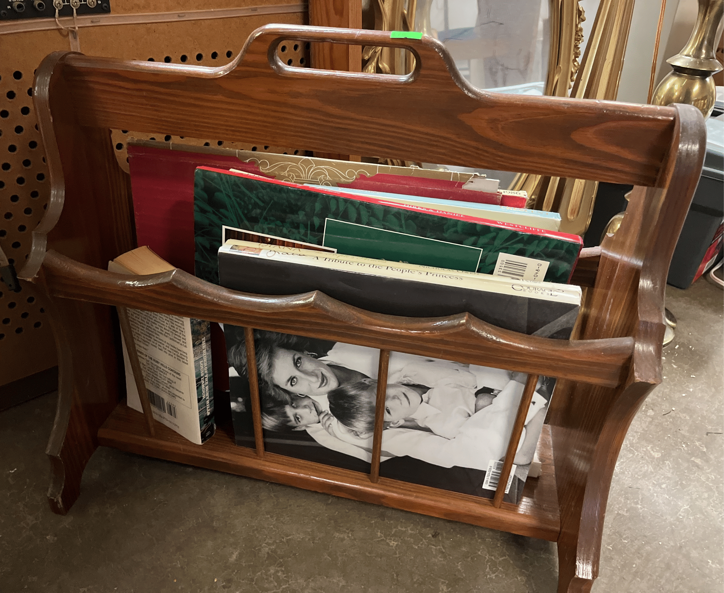 175 Wood magazine rack 16x16x11" with book assortment